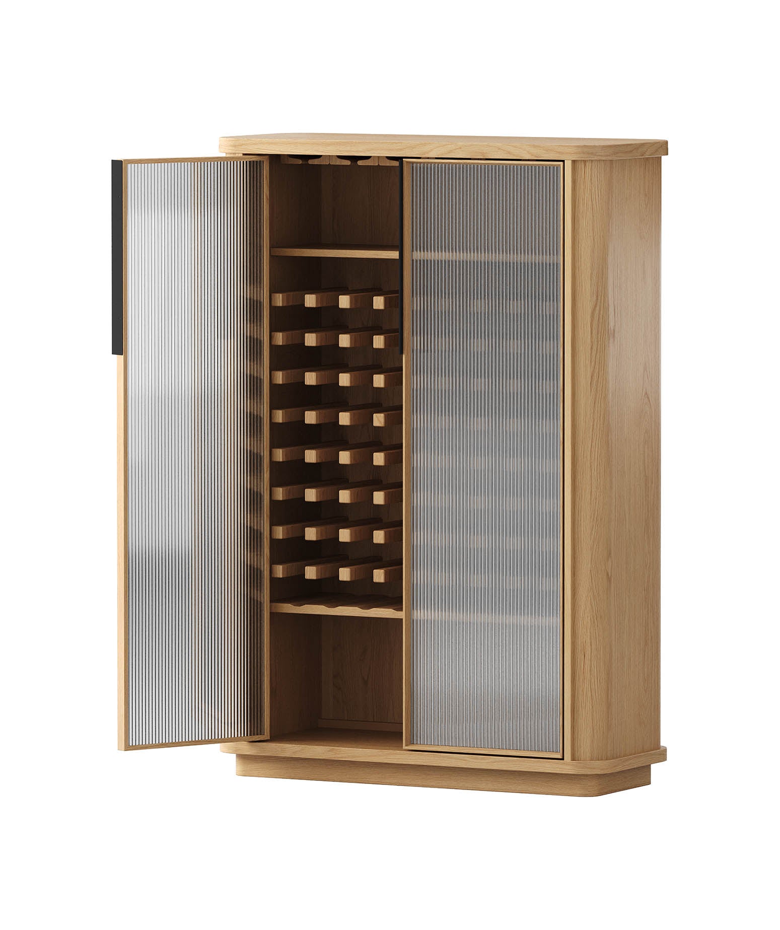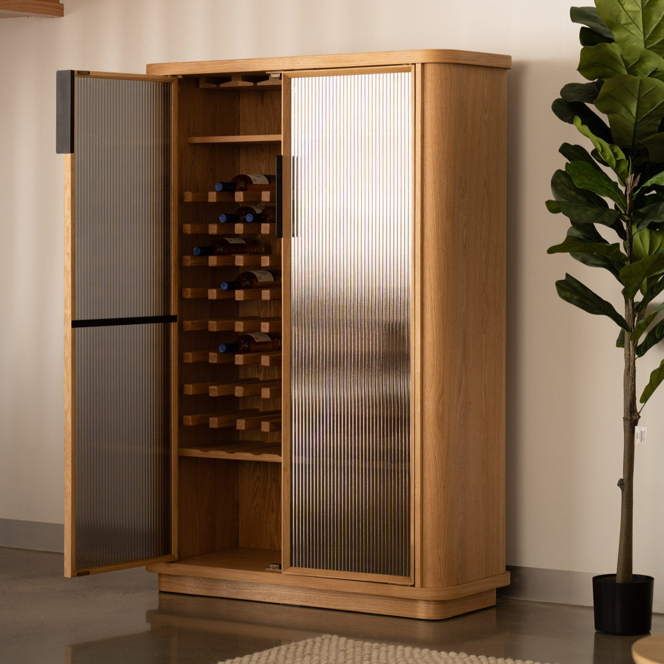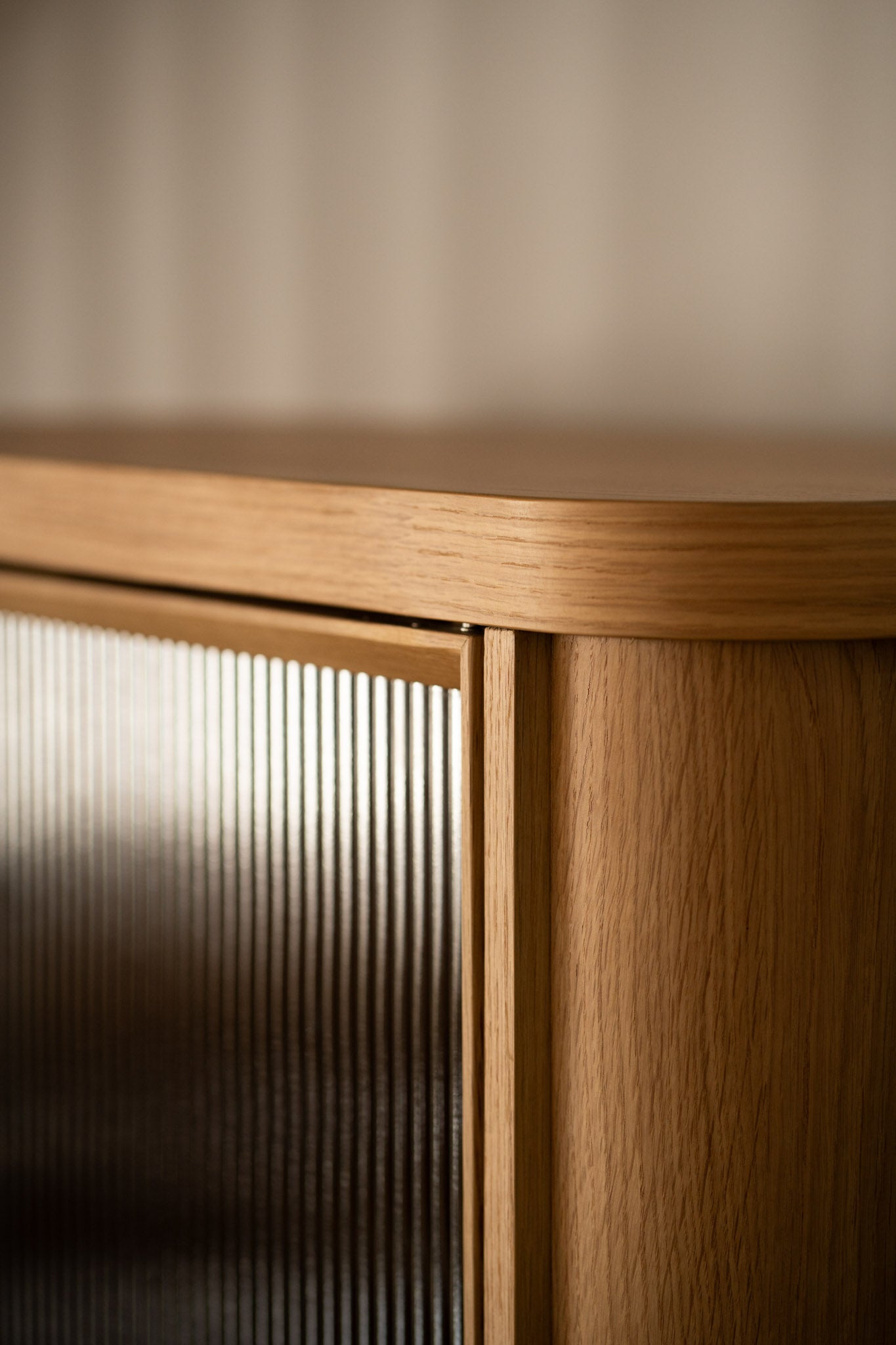 Premium American Oak timber veneer on engineered timber with curved blade legs, fluted glass accents.