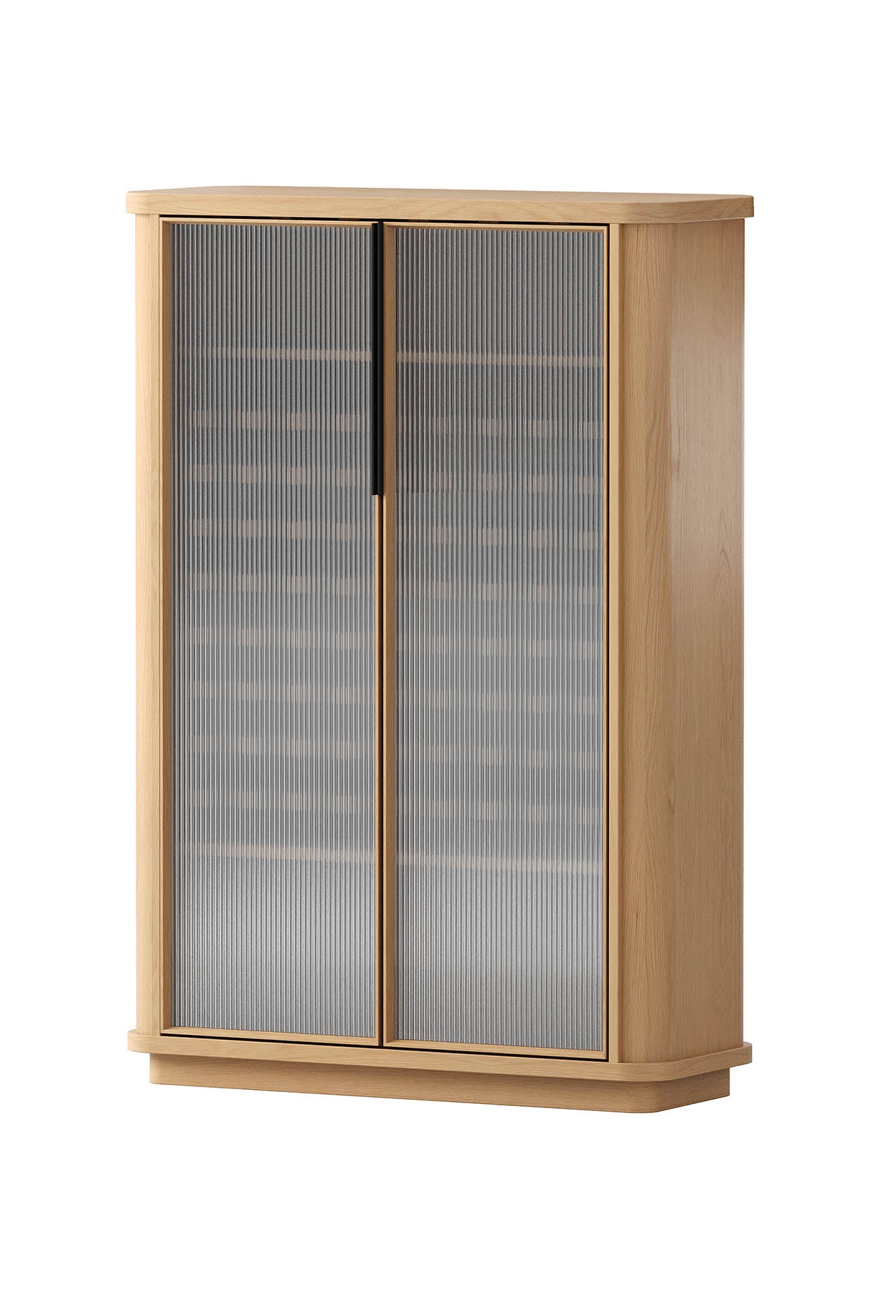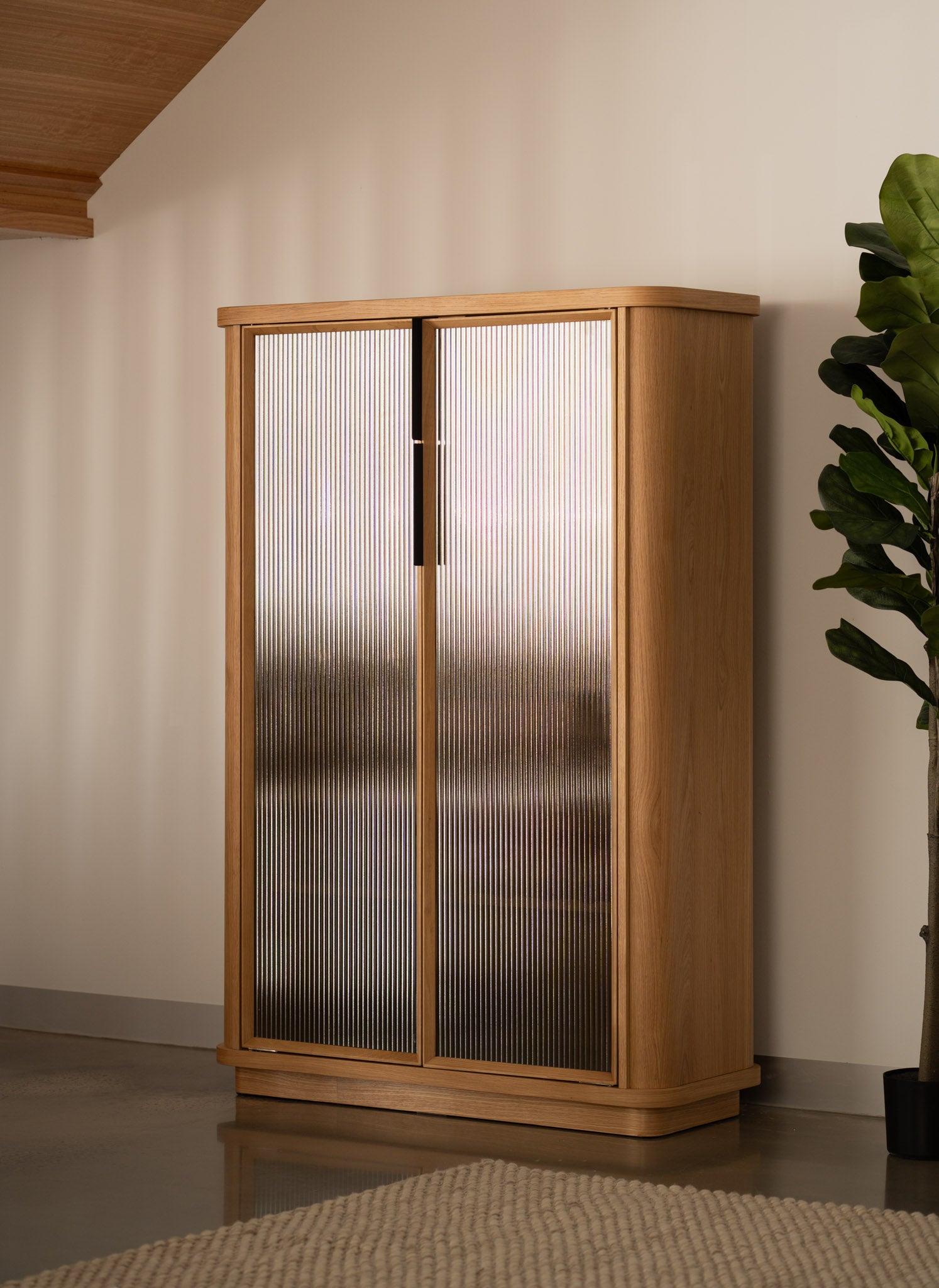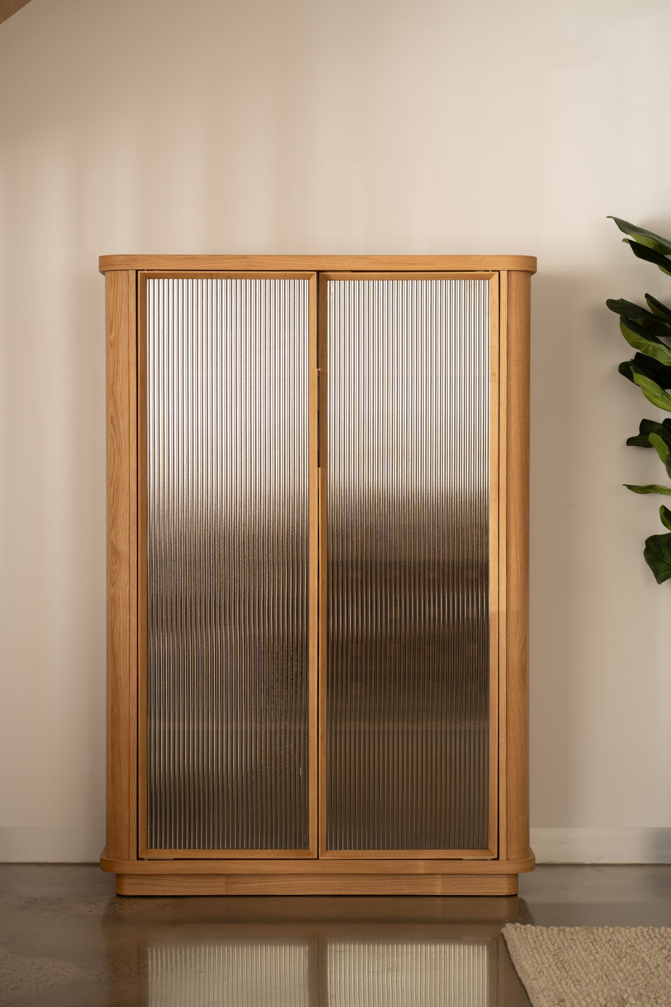 Premium American Oak timber veneer on engineered timber with curved blade legs, fluted glass accents.