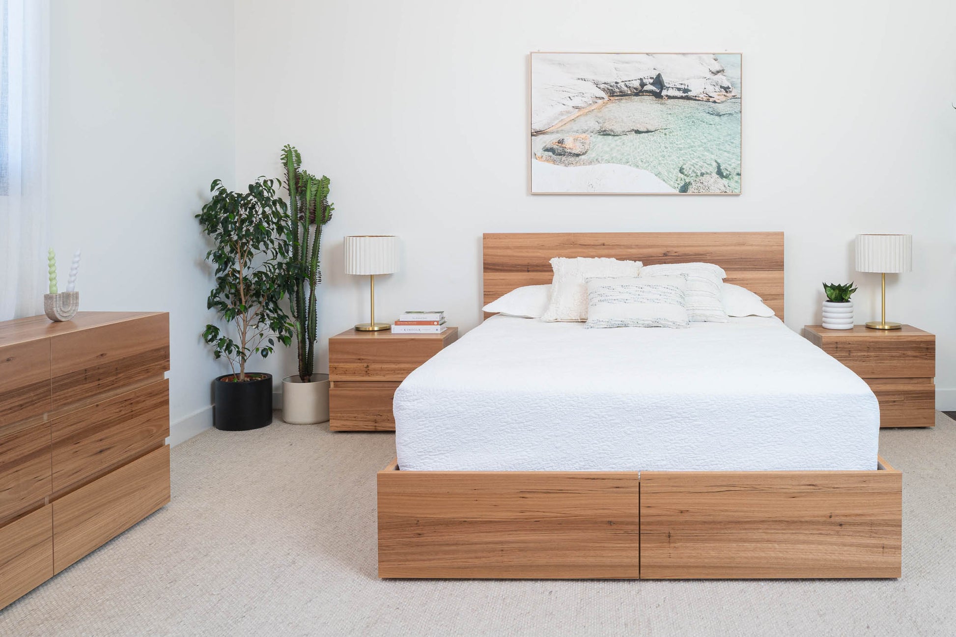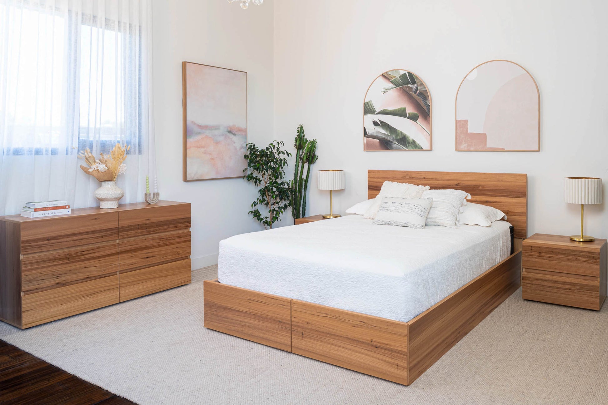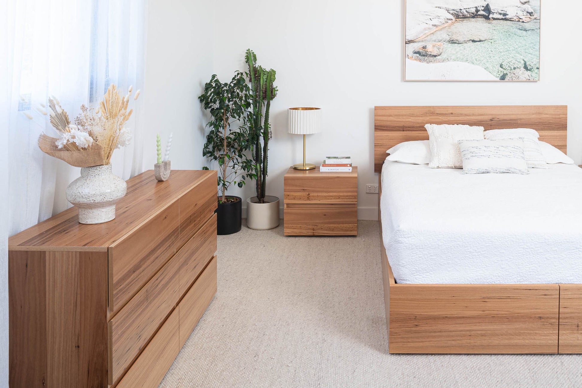 Explore the Dusk Bedroom Range, proudly 100% Australian Made and complete with matching case goods. Expertly crafted in Melbourne using stunning Australian Wormy Chestnut, this range features sleek straight-edge handles for a clean, contemporary finish. Pair it with the generously sized Dusk gas lift storage bed for the ultimate blend of style and practicality. With its refined design and ample storage, Dusk brings modern simplicity and everyday functionality to your bedroom.