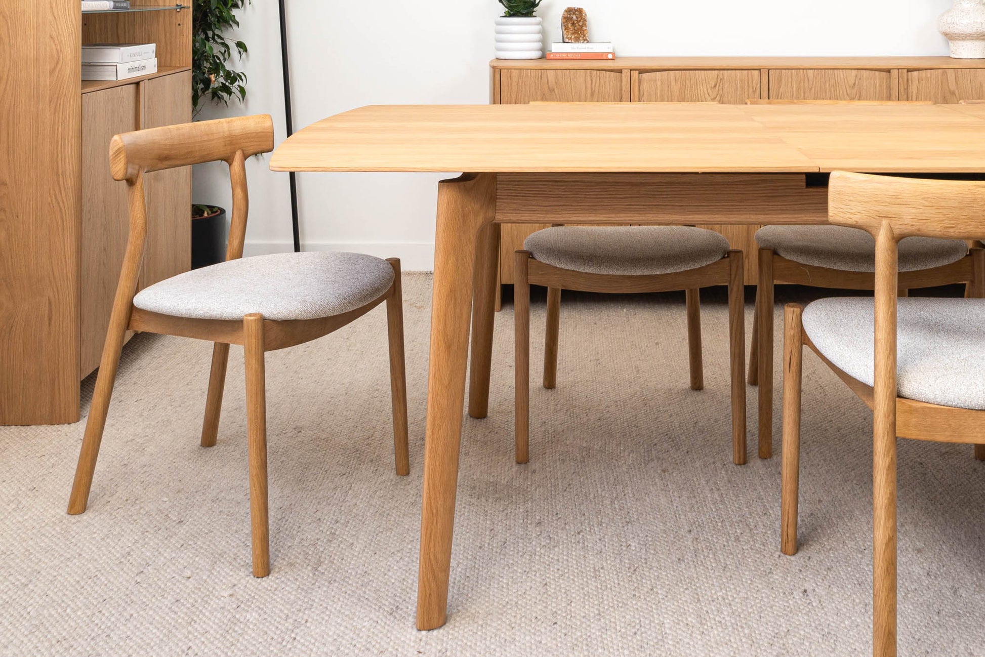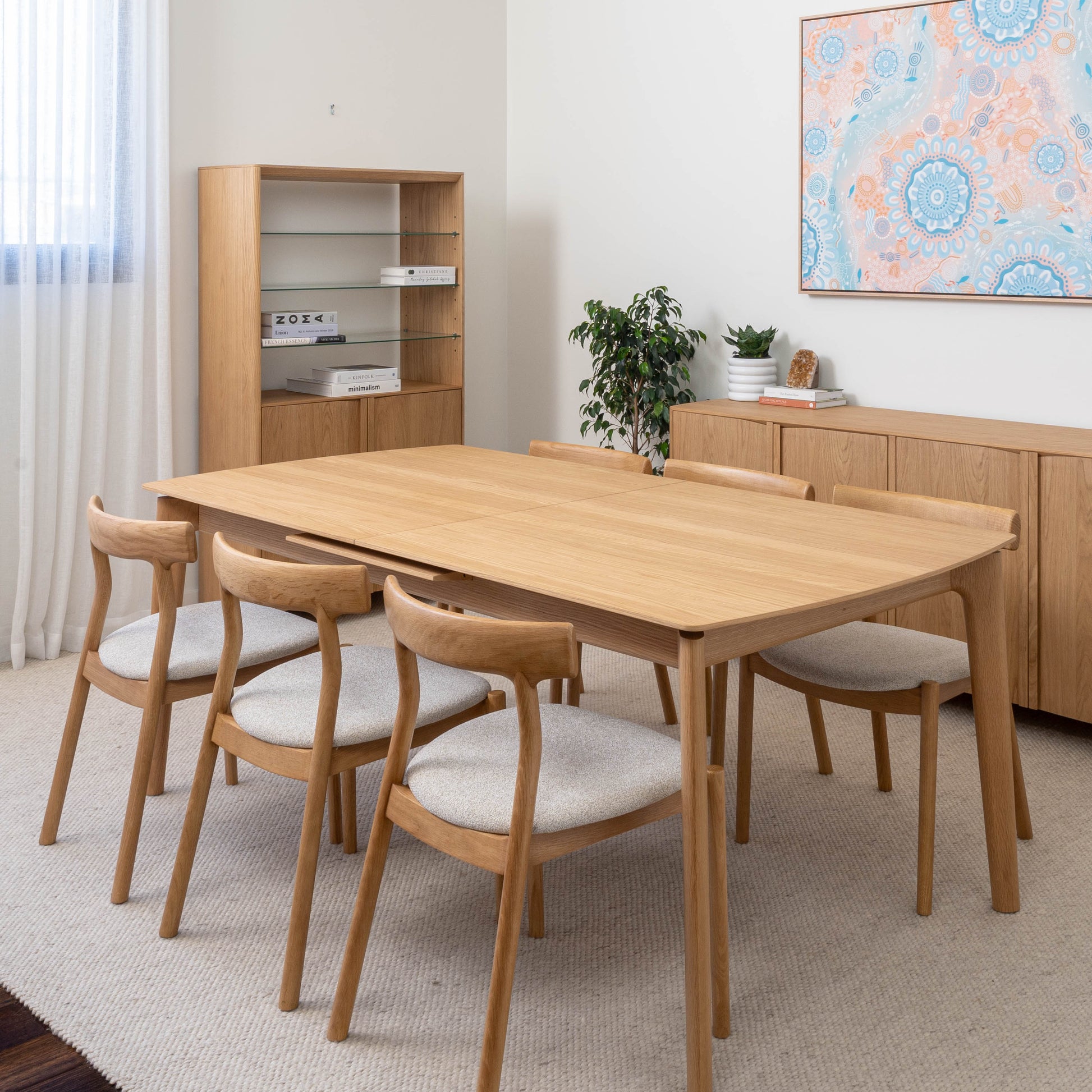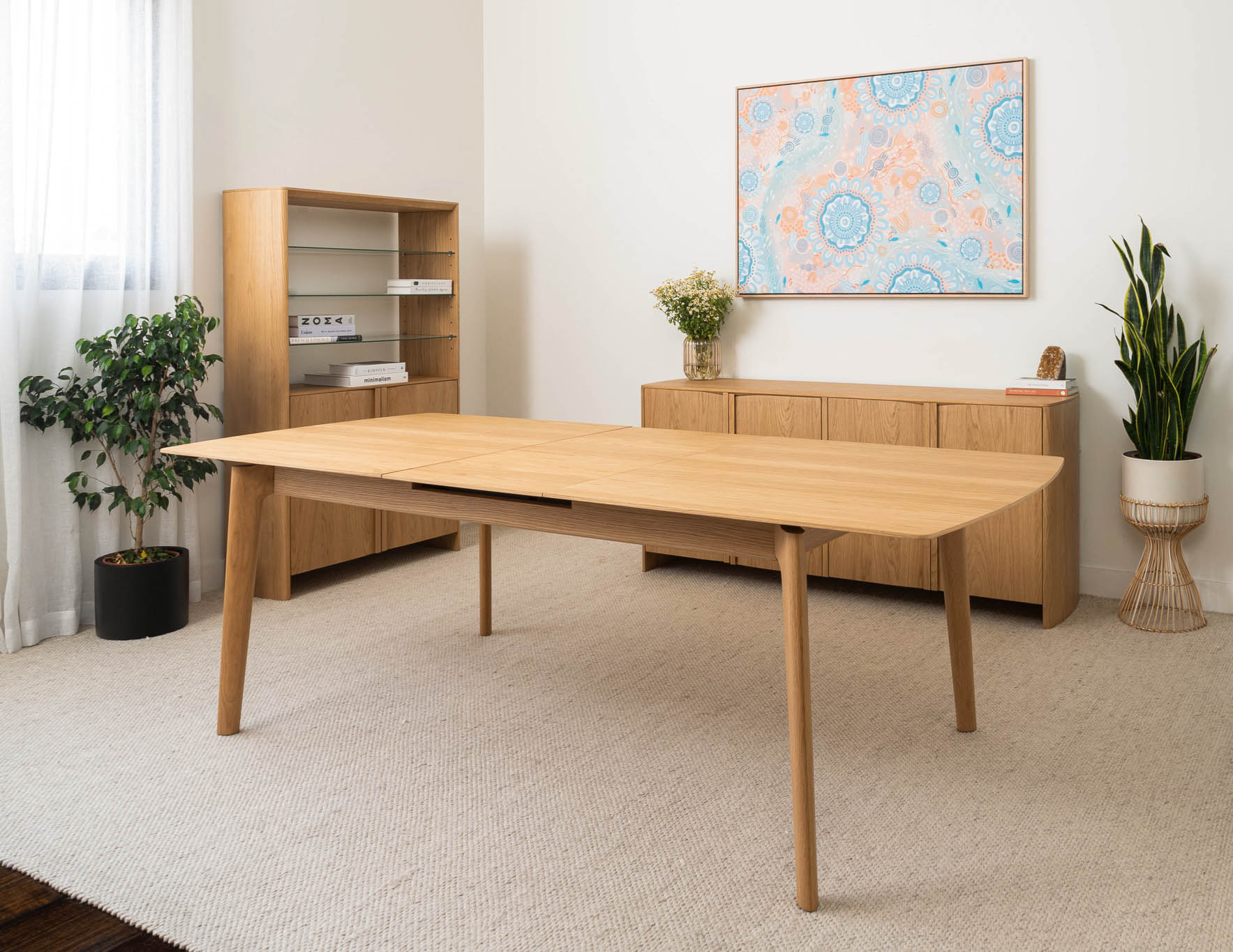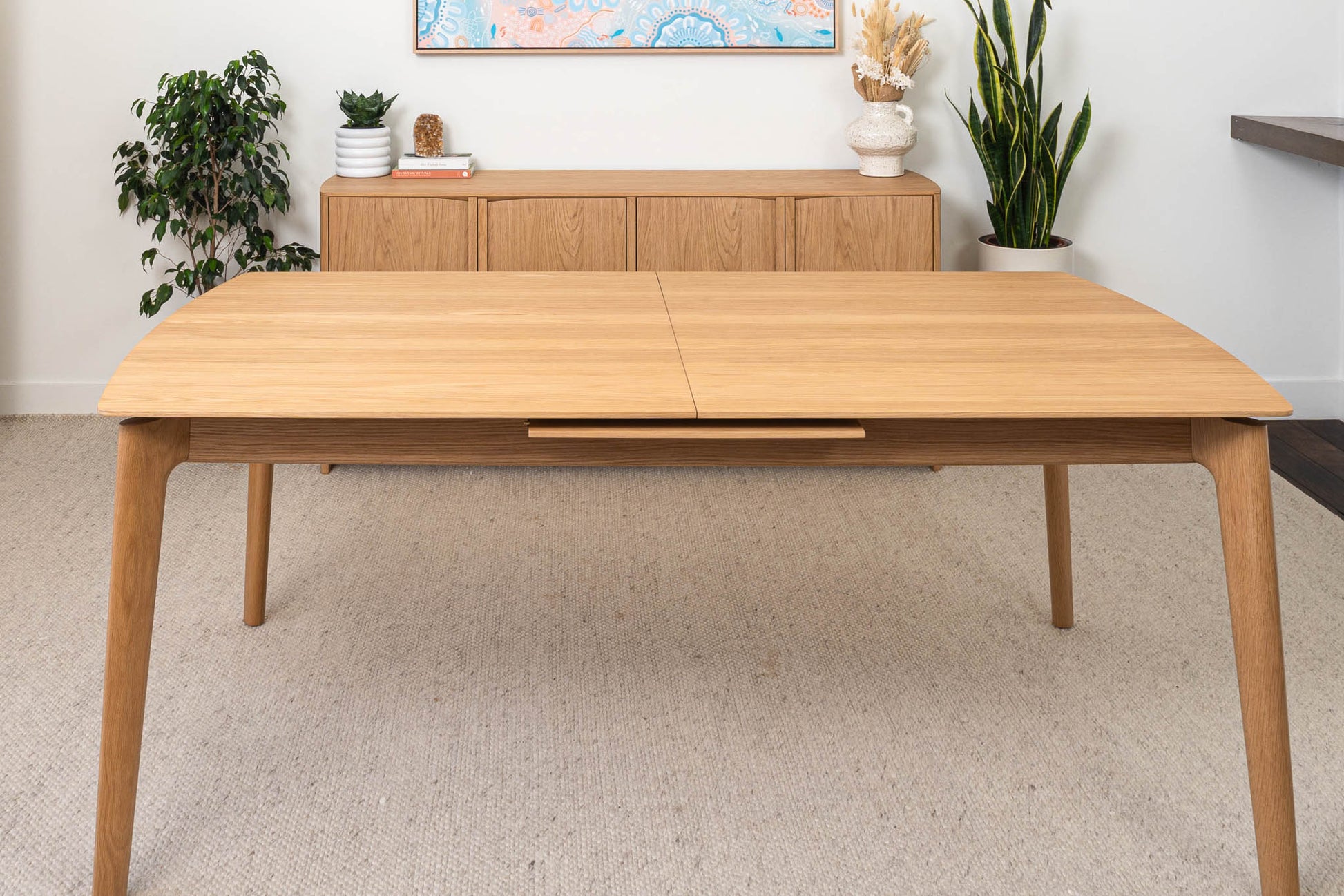 American Oak premium timber veneer on engineered timber with tapered solid timber handles and soft close hinges. Solid timber tapered leg design. Veneer table top, solid edges. Hassle-free extension table mechanism, 55cm extension leaf.