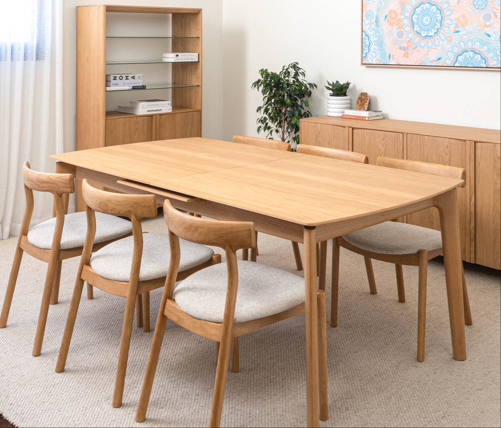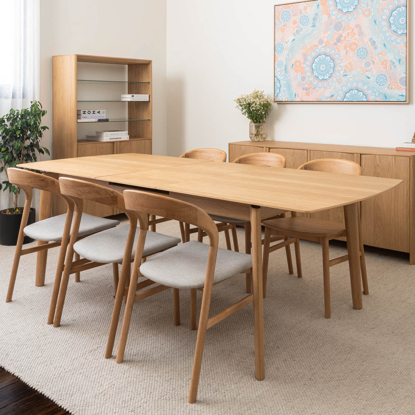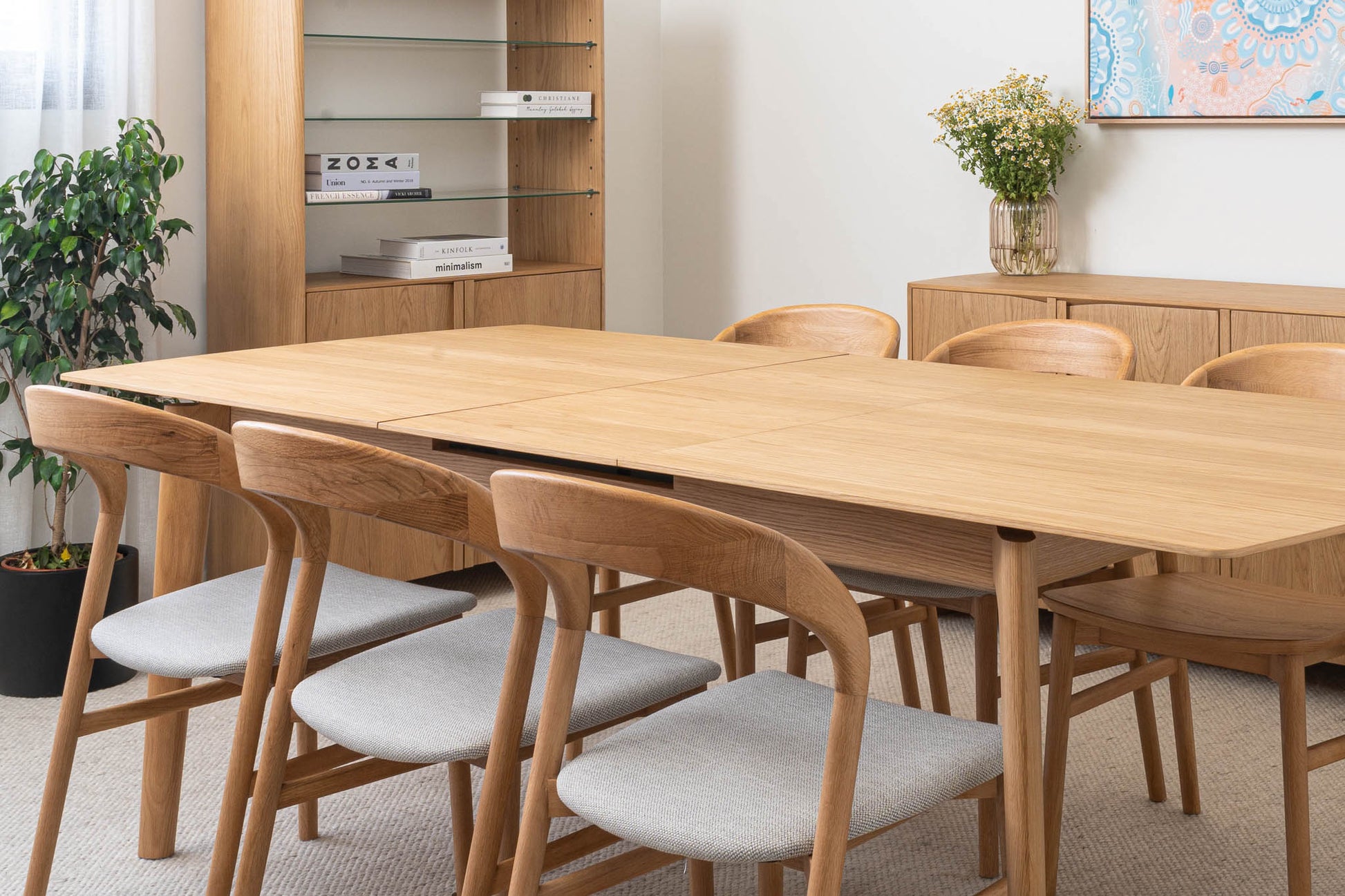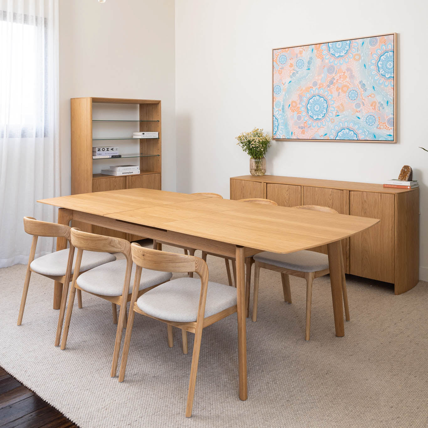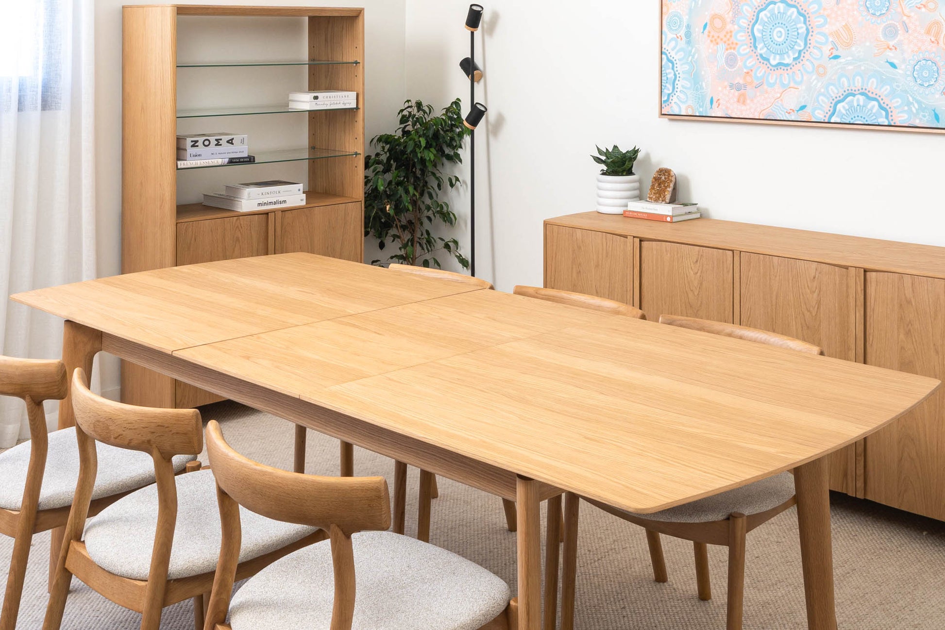 American Oak premium timber veneer on engineered timber with tapered solid timber handles and soft close hinges. Solid timber tapered leg design. Veneer table top, solid edges. Hassle-free extension table mechanism, 55cm extension leaf.