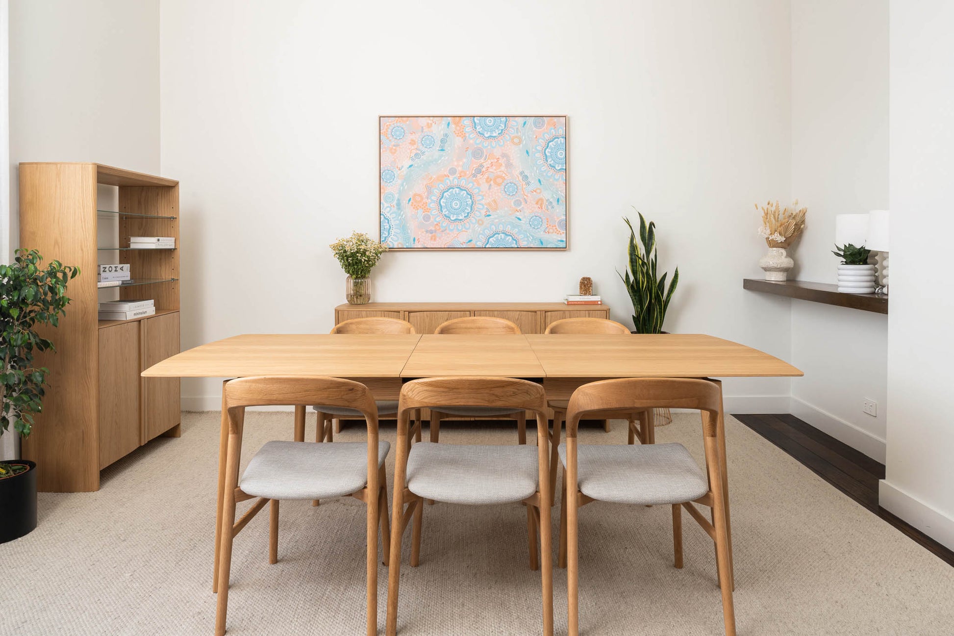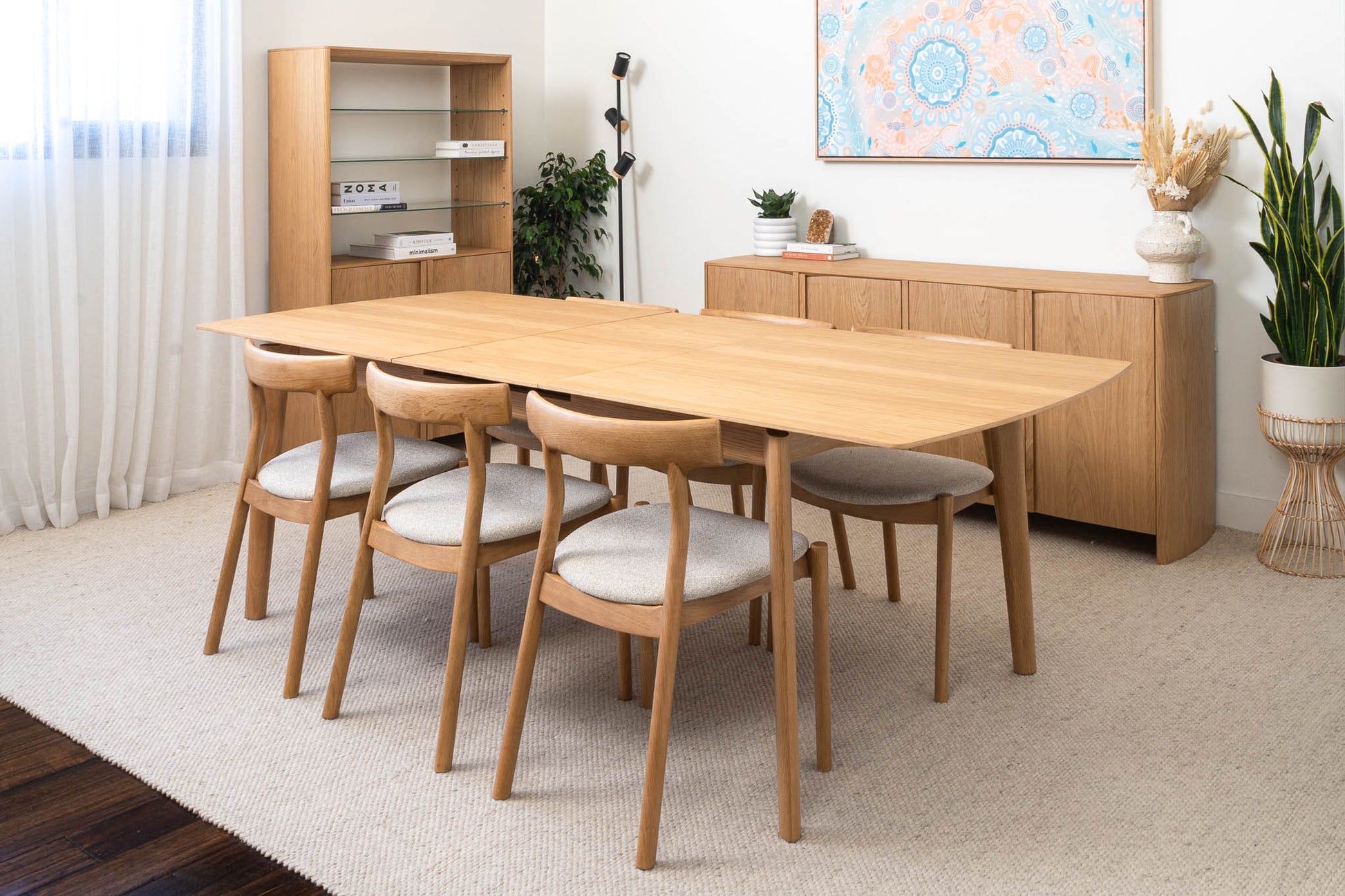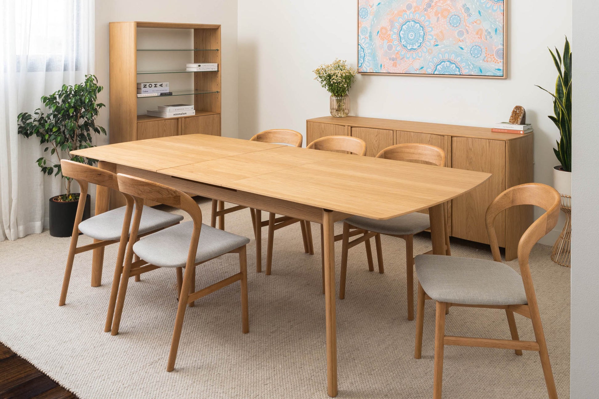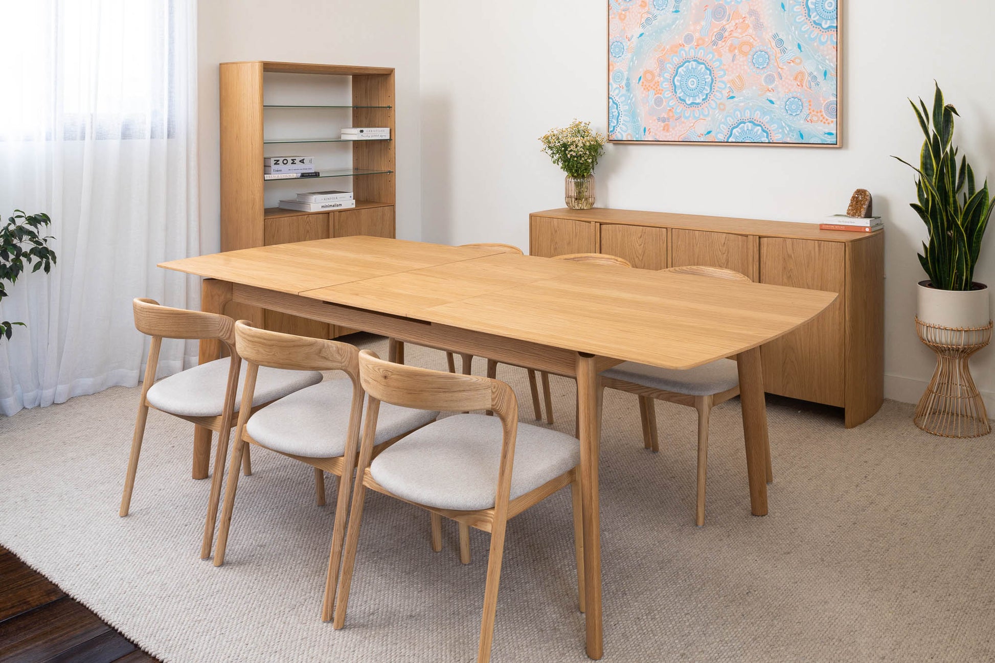 American Oak premium timber veneer on engineered timber with tapered solid timber handles and soft close hinges. Solid timber tapered leg design. Veneer table top, solid edges. Hassle-free extension table mechanism, 55cm extension leaf.