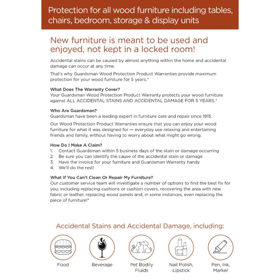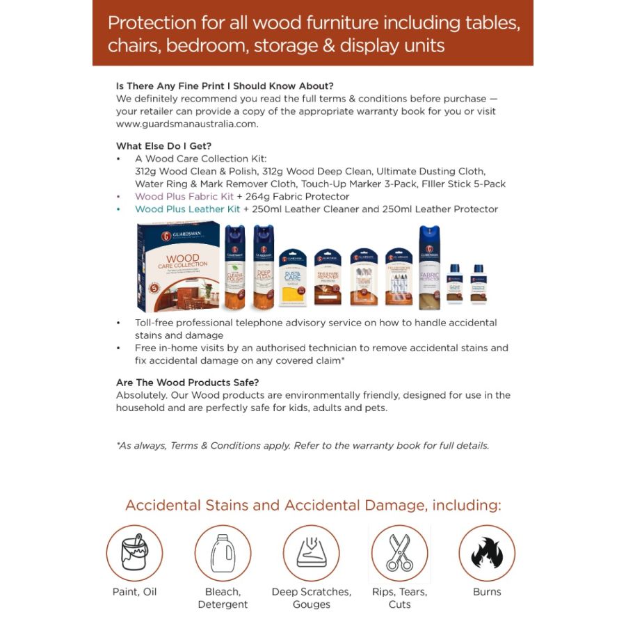 5-year product warranty protection against accidental stains & damage for timber furniture. Our Timber self-application Kit is designed to protect and extend the life of timber furniture. The easy-to-use kit provides everything you need to apply protection, including step-by-step application instructions. Please see the product images and box instructions to register your product.