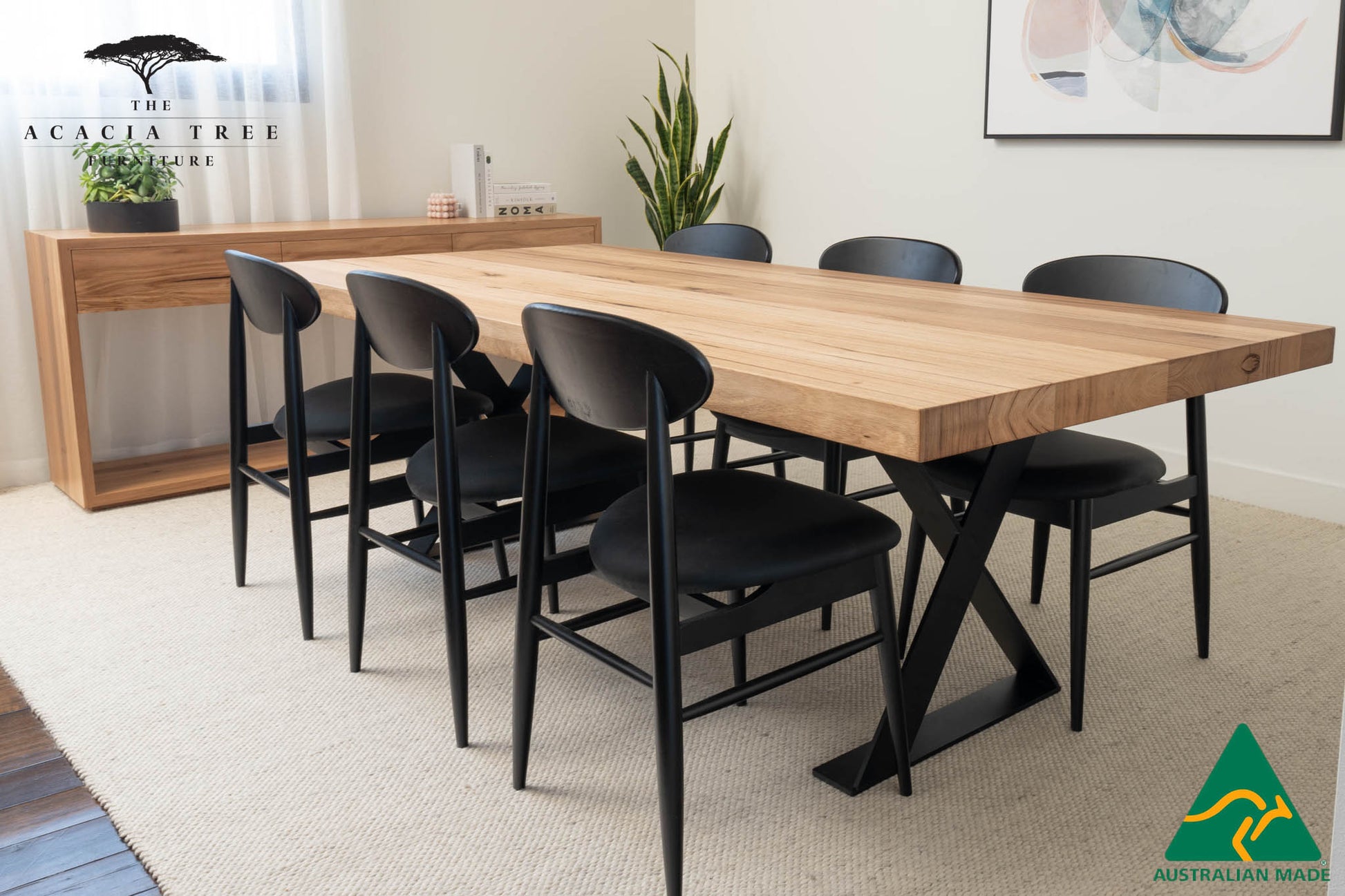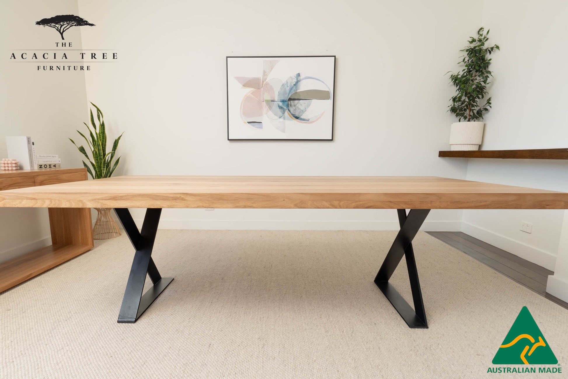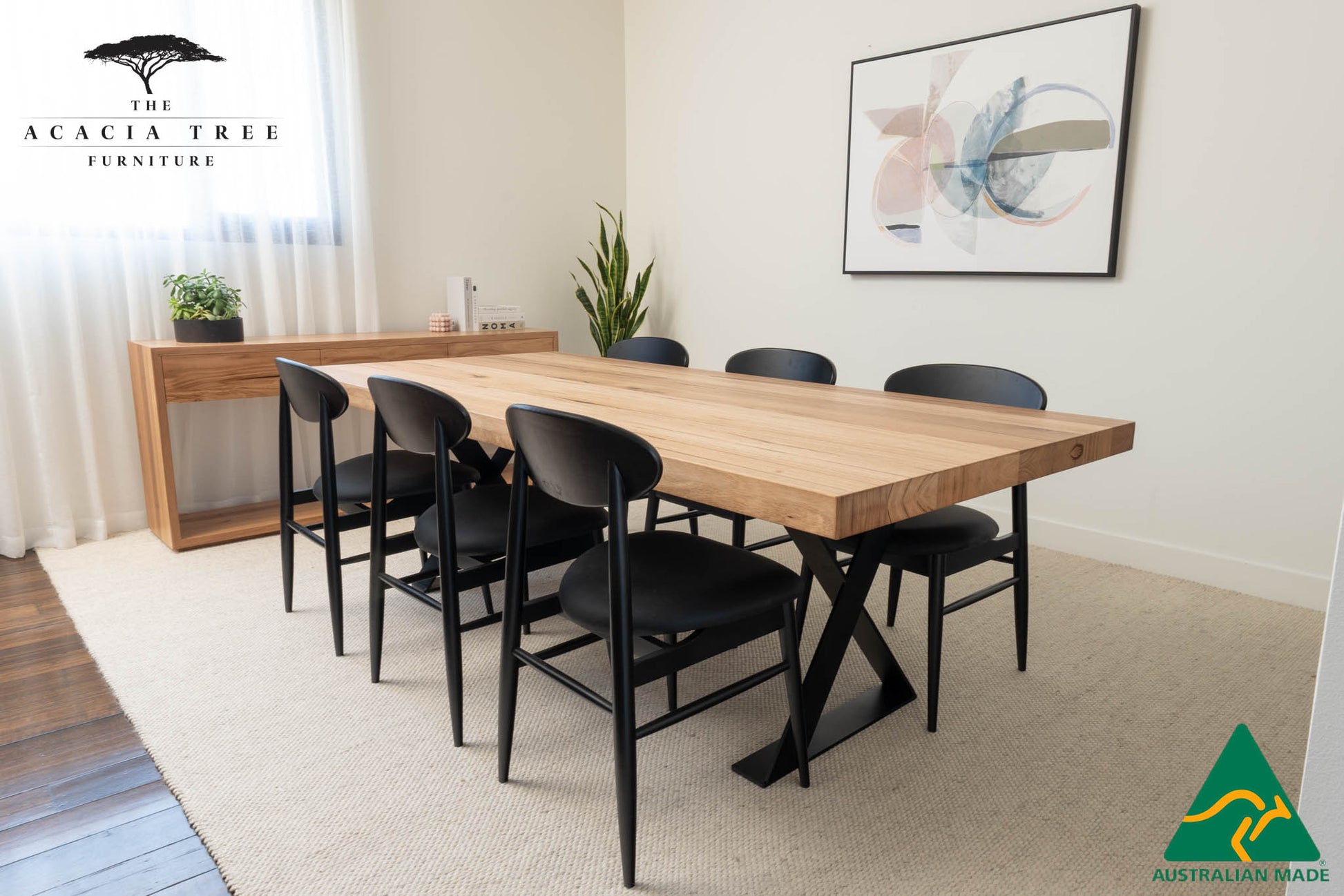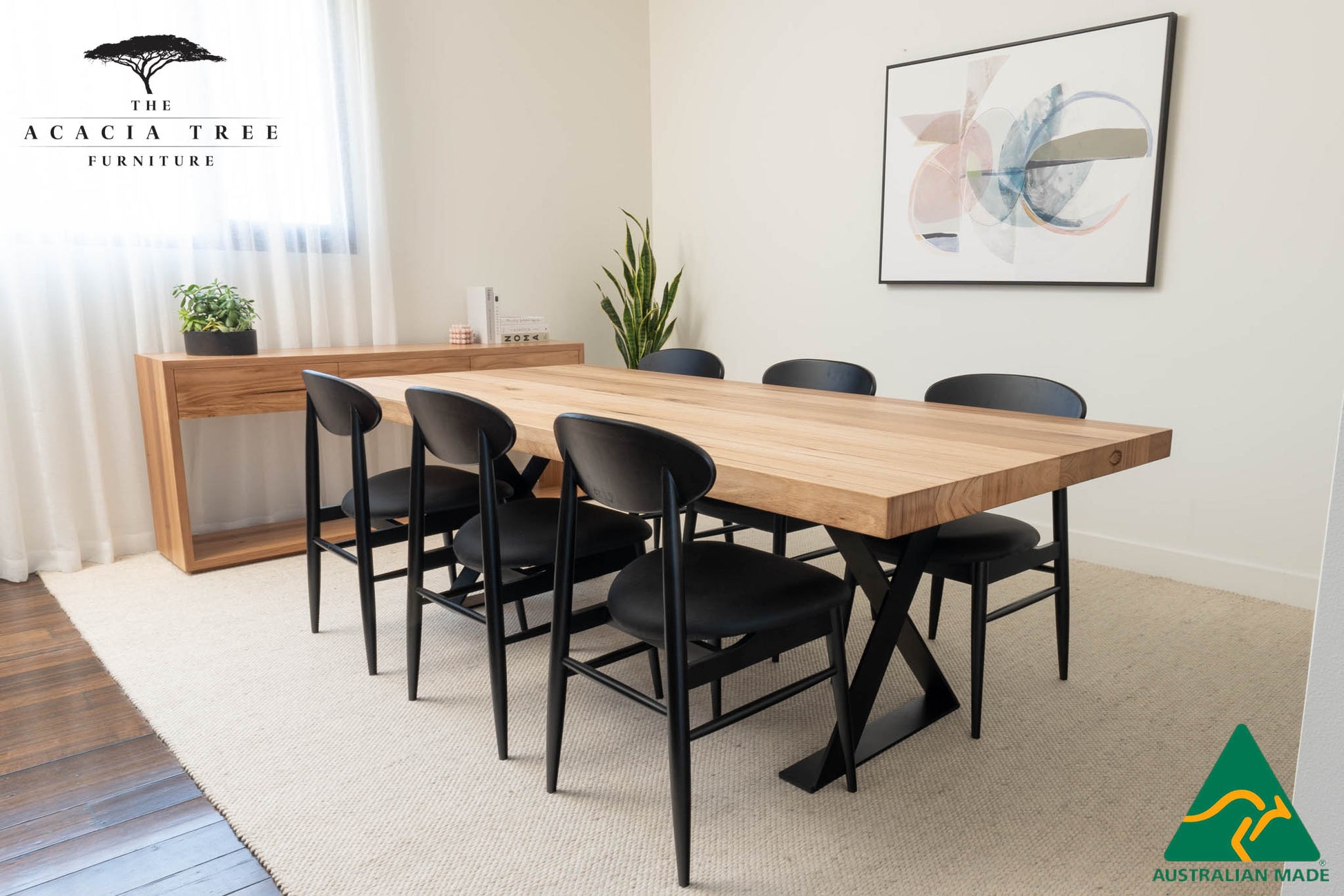 Discover the epitome of craftsmanship with our Onyx Solid Australian Hardwood Dining Table, meticulously handcrafted in the heart of Australia. What sets this table apart are its comfortable X legs that allow for the chairs to tuck all the way into the table when not in use. Each Onyx Solid Australian Hardwood Dining Table boasts a substantial 65mm thick top with a 32.5mm solid slab with a 32.5mm seamless lip enhancing both its visual appeal and structural presence
