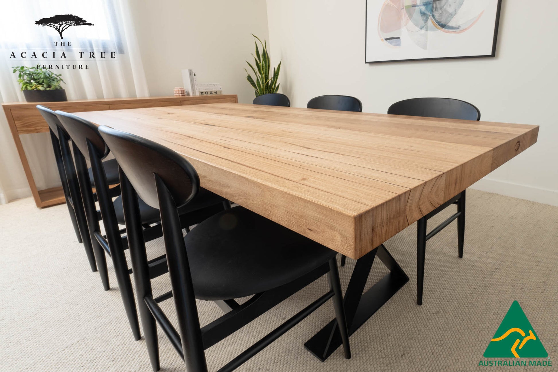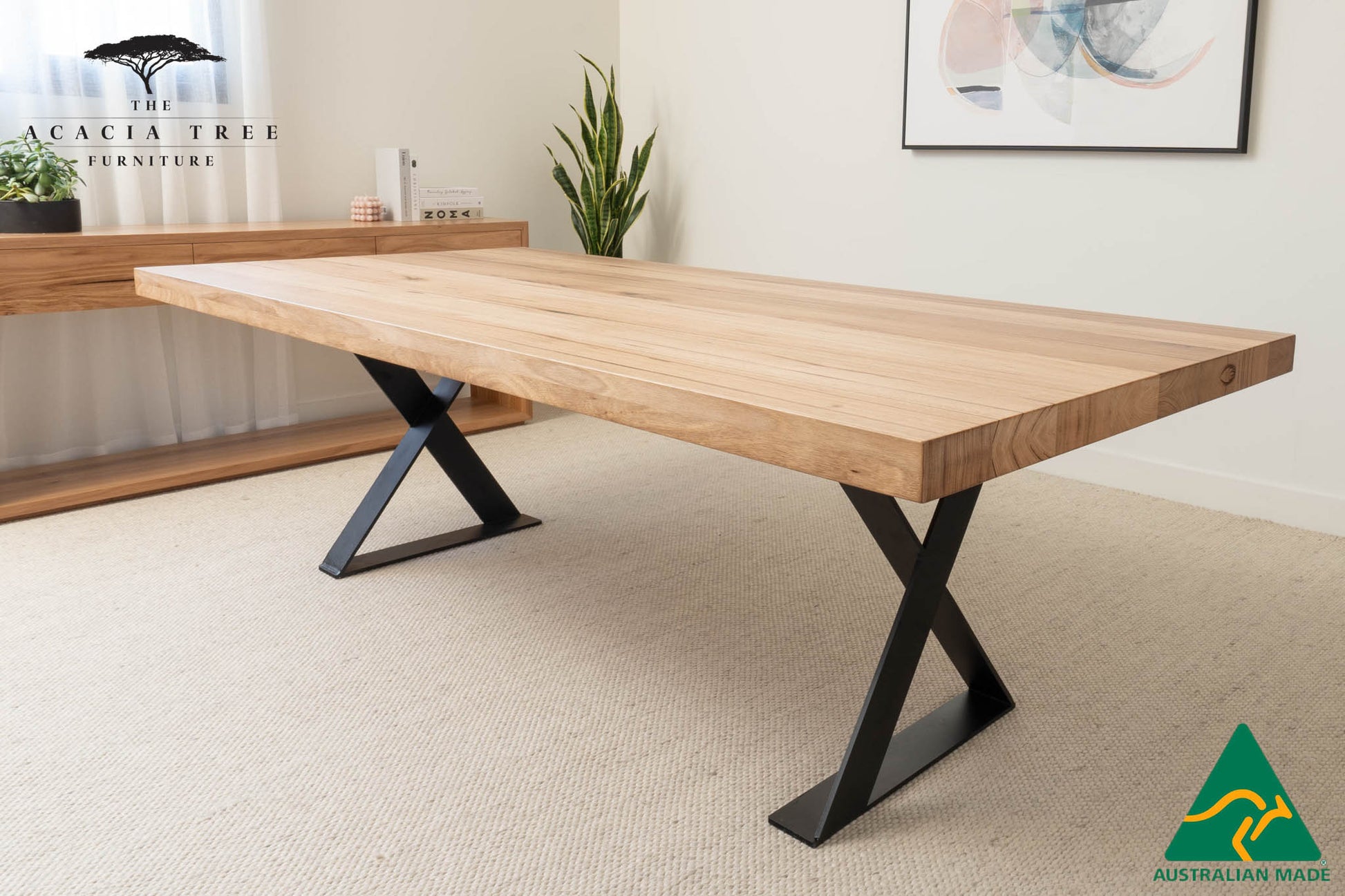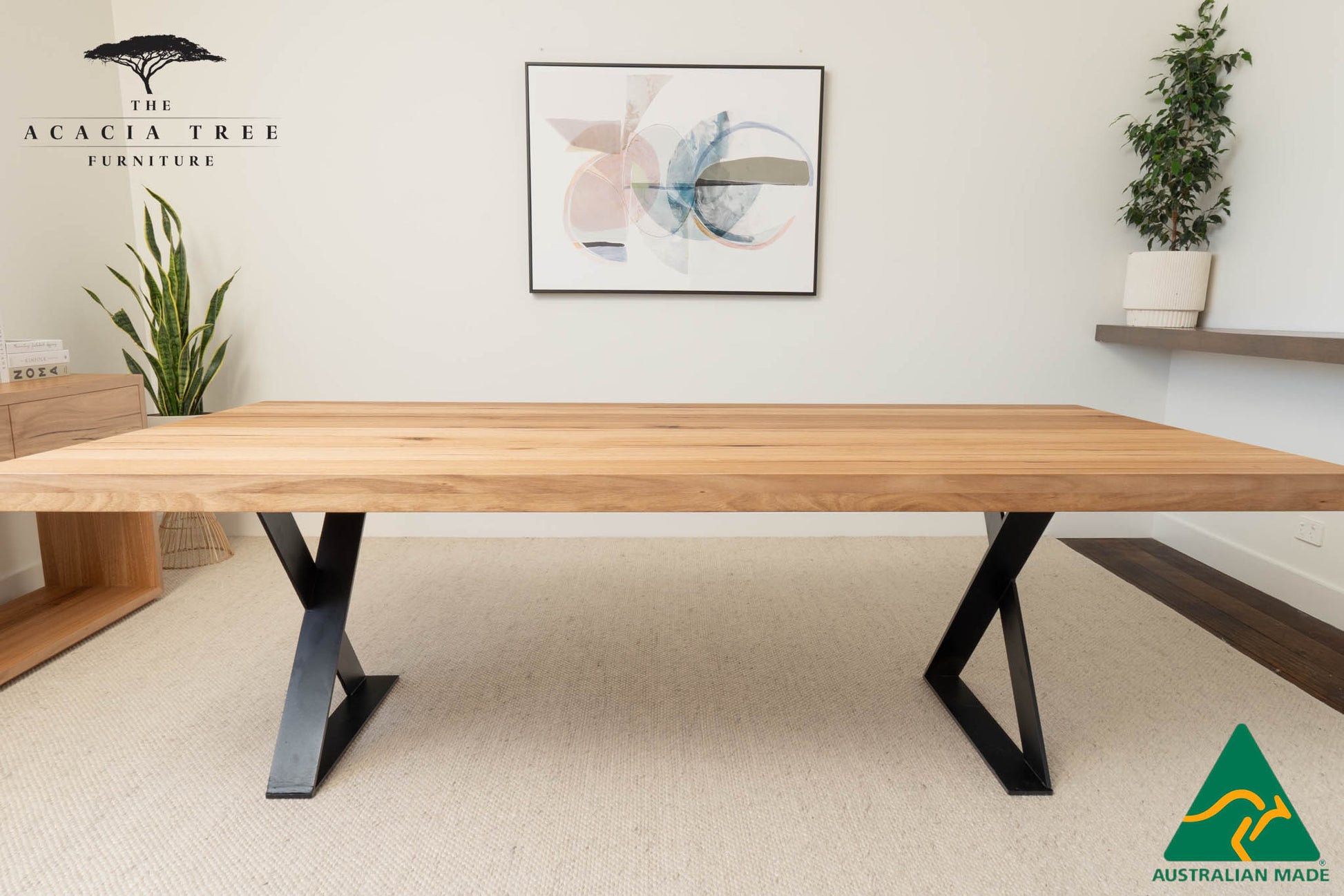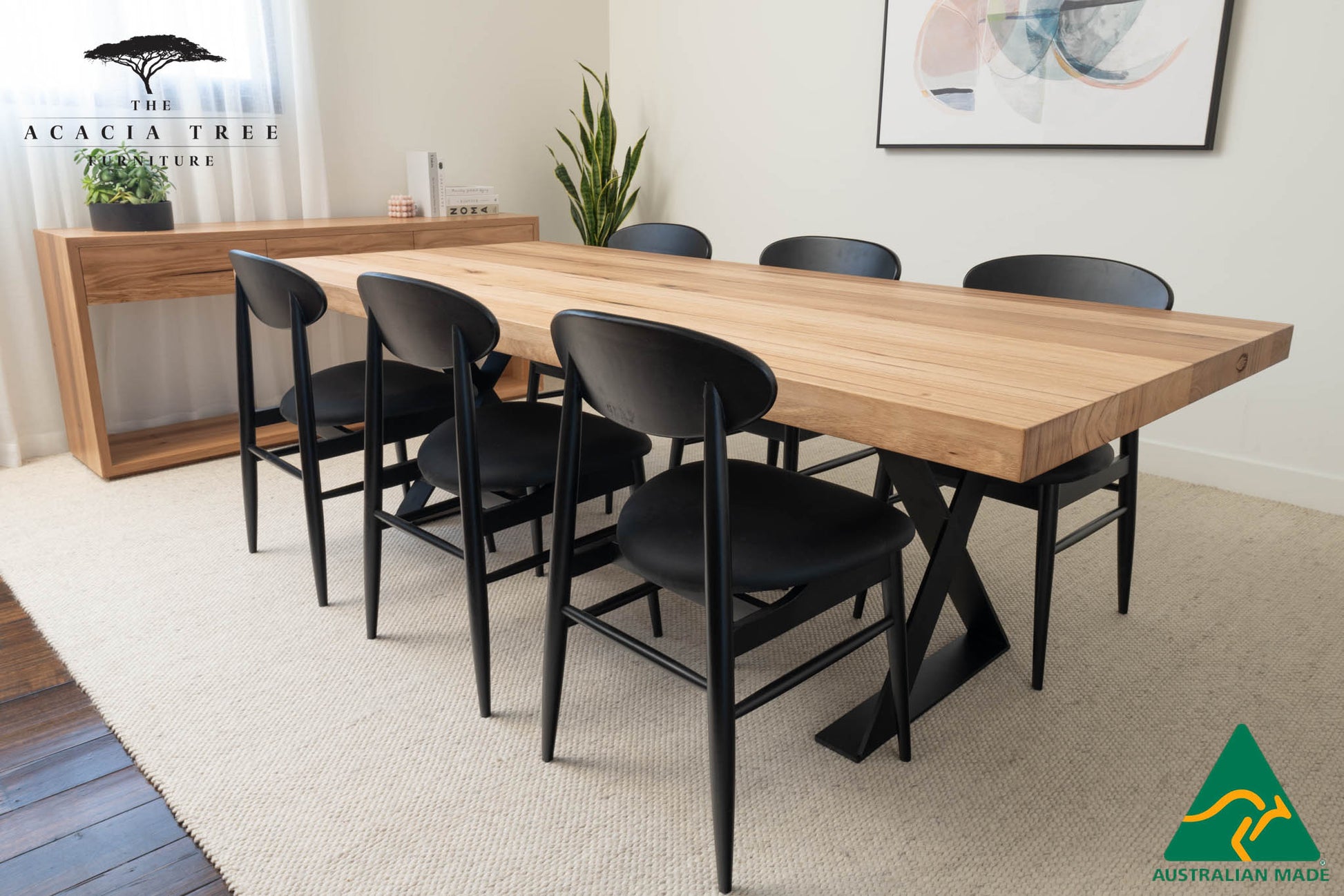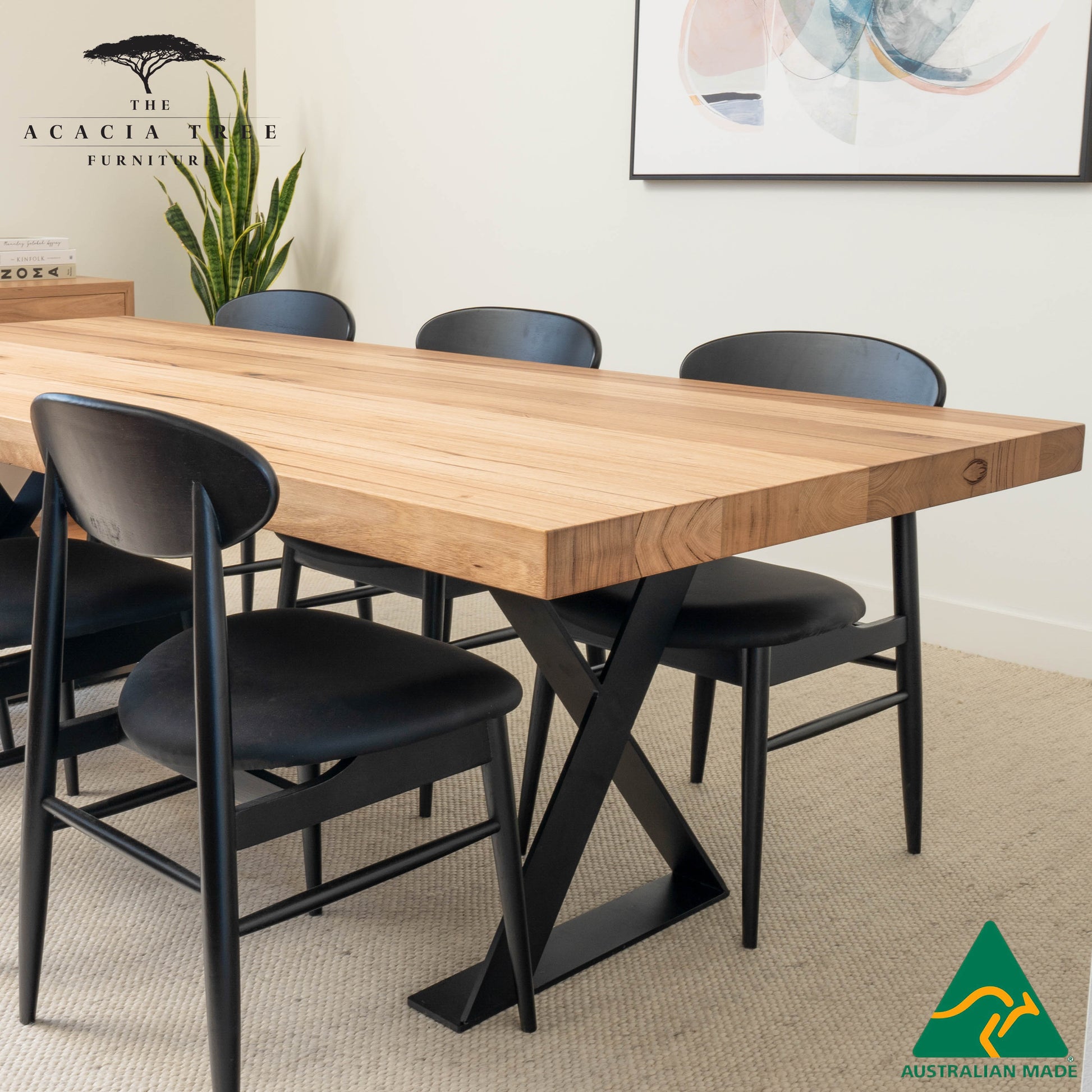 Discover the epitome of craftsmanship with our Onyx Solid Australian Hardwood Dining Table, meticulously handcrafted in the heart of Australia. What sets this table apart are its comfortable X legs that allow for the chairs to tuck all the way into the table when not in use. Each Onyx Solid Australian Hardwood Dining Table boasts a substantial 65mm thick top with a 32.5mm solid slab with a 32.5mm seamless lip enhancing both its visual appeal and structural presence
