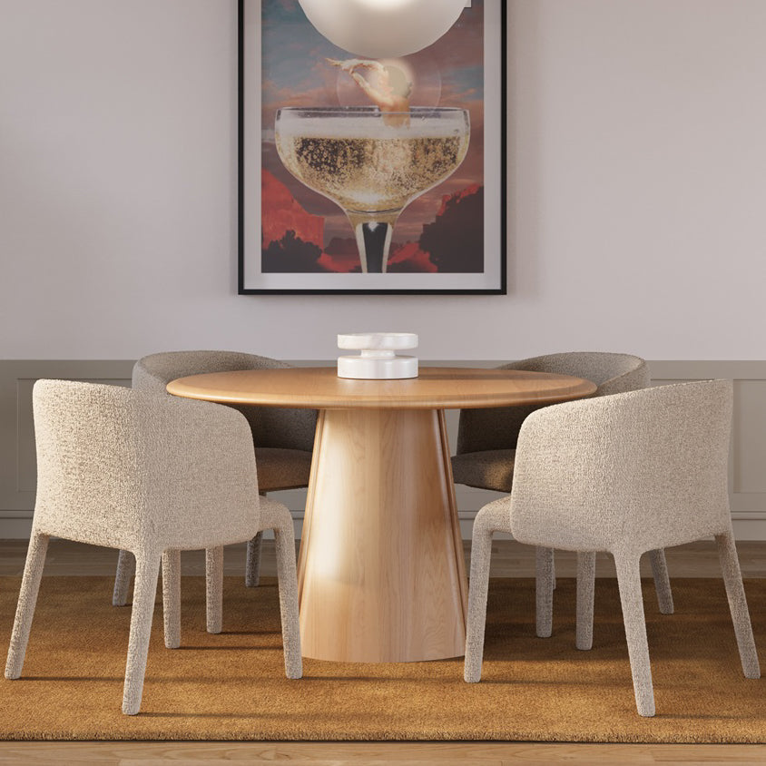 The Leora Collection brings timeless charm to your home with the Leora dining set, where organic shapes, rounded soft edges, and pedestal legs create a serene and welcoming atmosphere. The warmth of natural oak harmonizes with gentle contours, offering a refreshing perspective for both living and dining spaces. The collection features a unique table edge profile with solid timber inlay and soft triangular pedestal bases, adding a distinctive touch to your home. Casegoods showcase handle-less doors and drawers with sleek edge design, while soft-close hinges ensure smooth functionality.