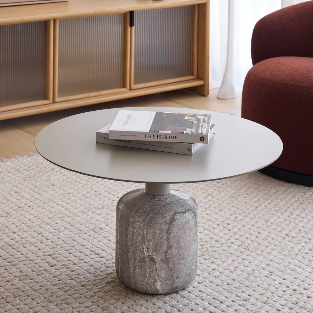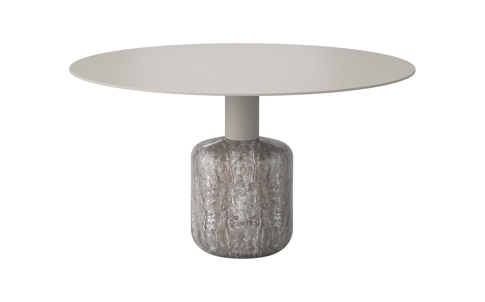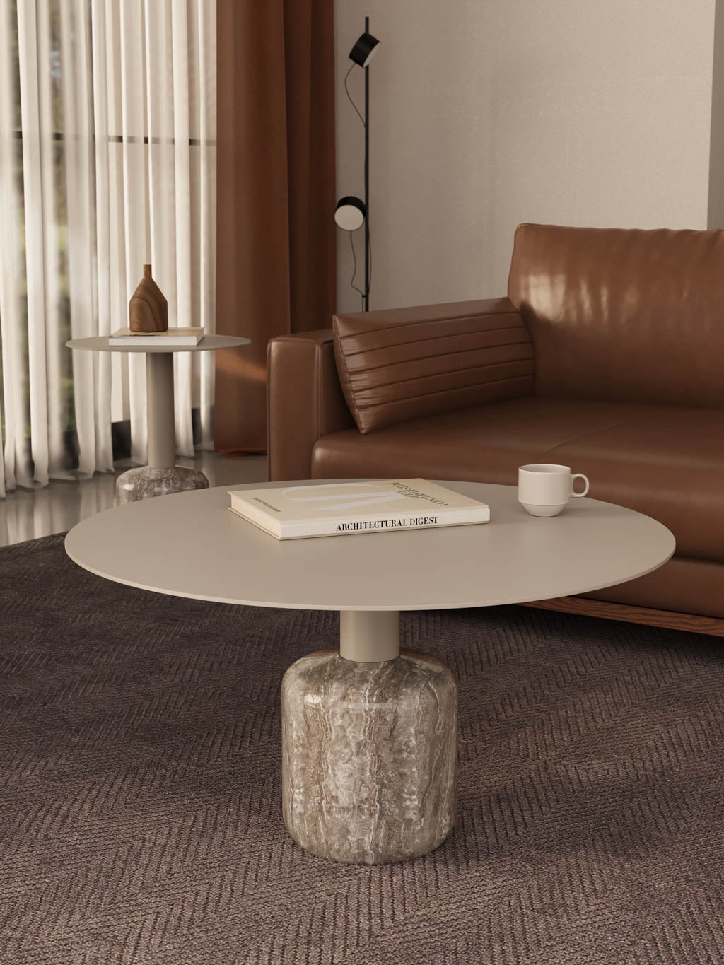 The Marcien table range embodies elegance and durability with its seamless blend of natural stone and refined metal. A sculpted solid silver travertine base, carved from a single block, creates a fluid, organic foundation. The taupe powder-coated steel top adds a striking contrast, combining strength with sophistication. Available in side and coffee table options, Marcien’s detachable top and contemporary round silhouette make it a versatile, timeless addition to any space.