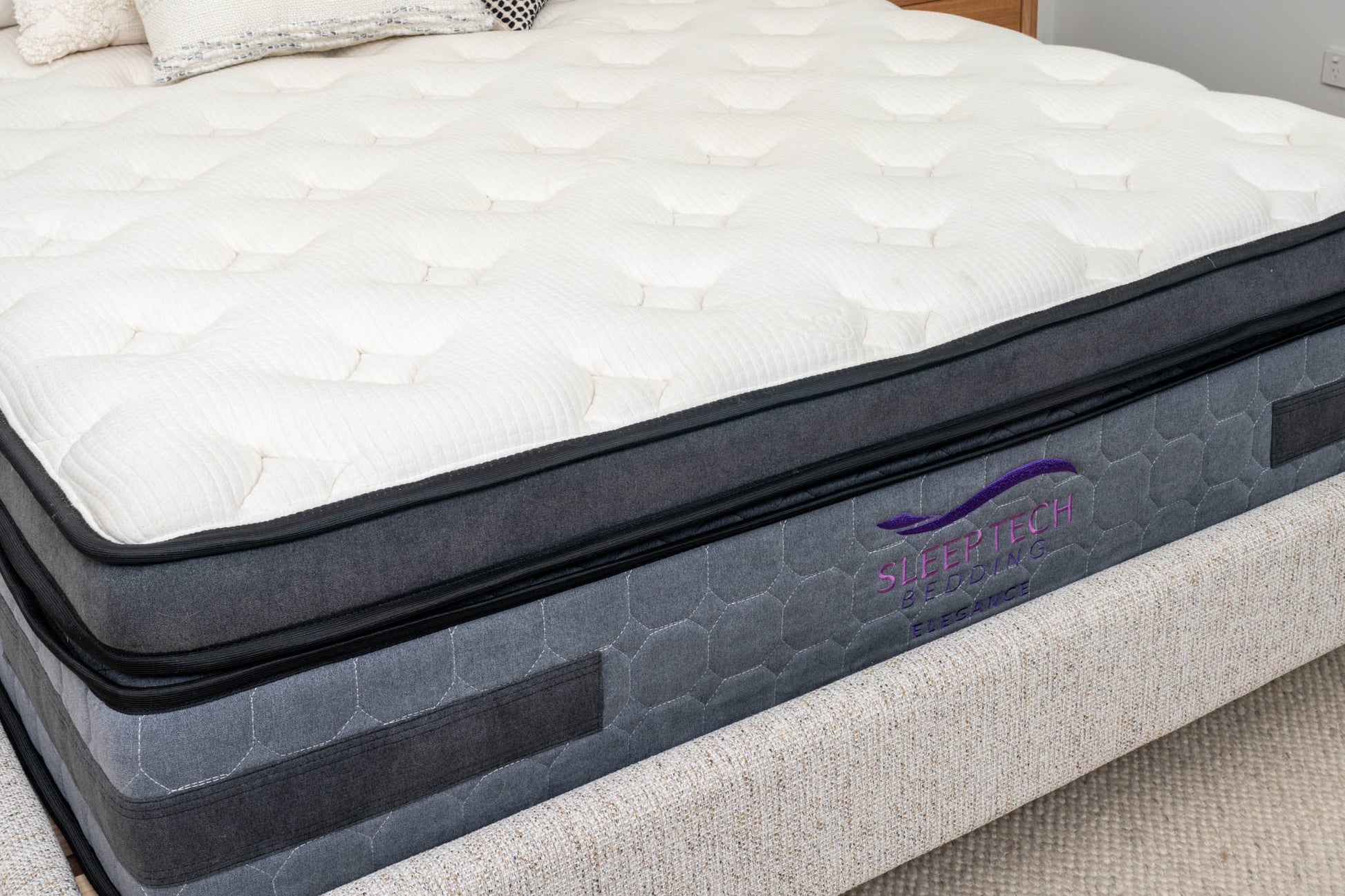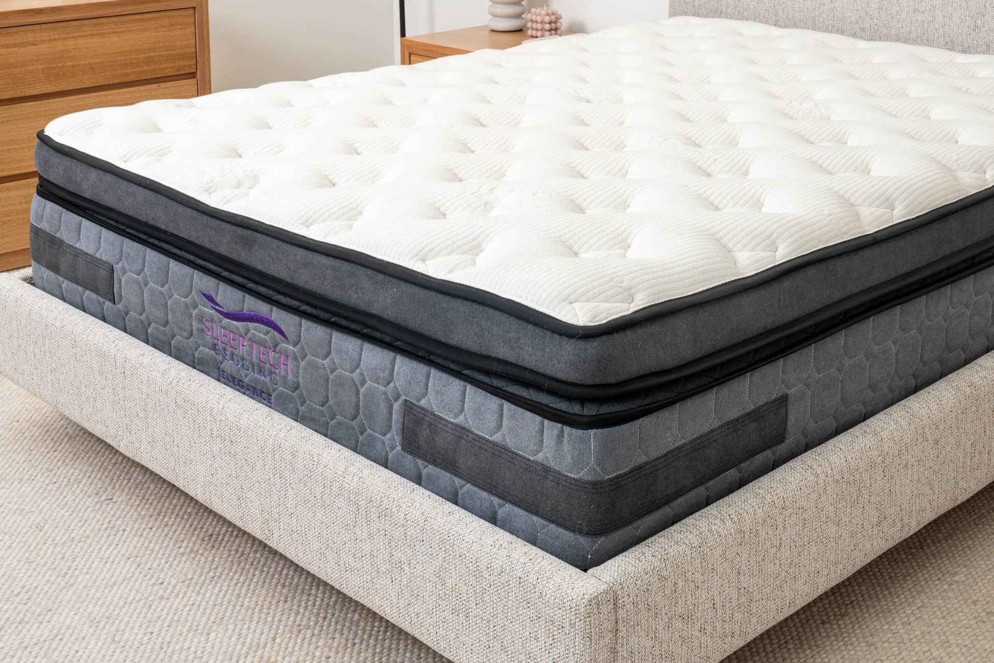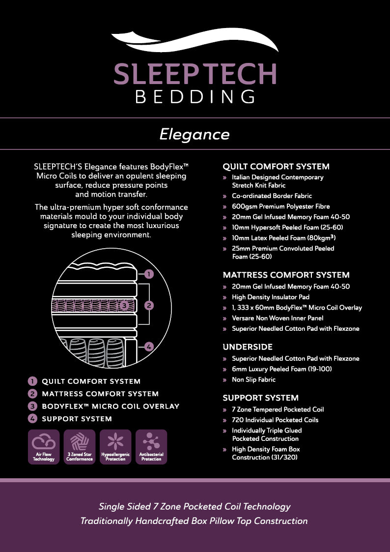 The SleepTech Elegance Mattress delivers premium comfort at a budget-friendly price. Featuring BodyFlex™ Micro Coils, gel memory foam, and a 7-zone pocket coil system, it offers breathable support and reduced motion transfer. Finished with a soft stretch-knit cover and edge support for all-night comfort.