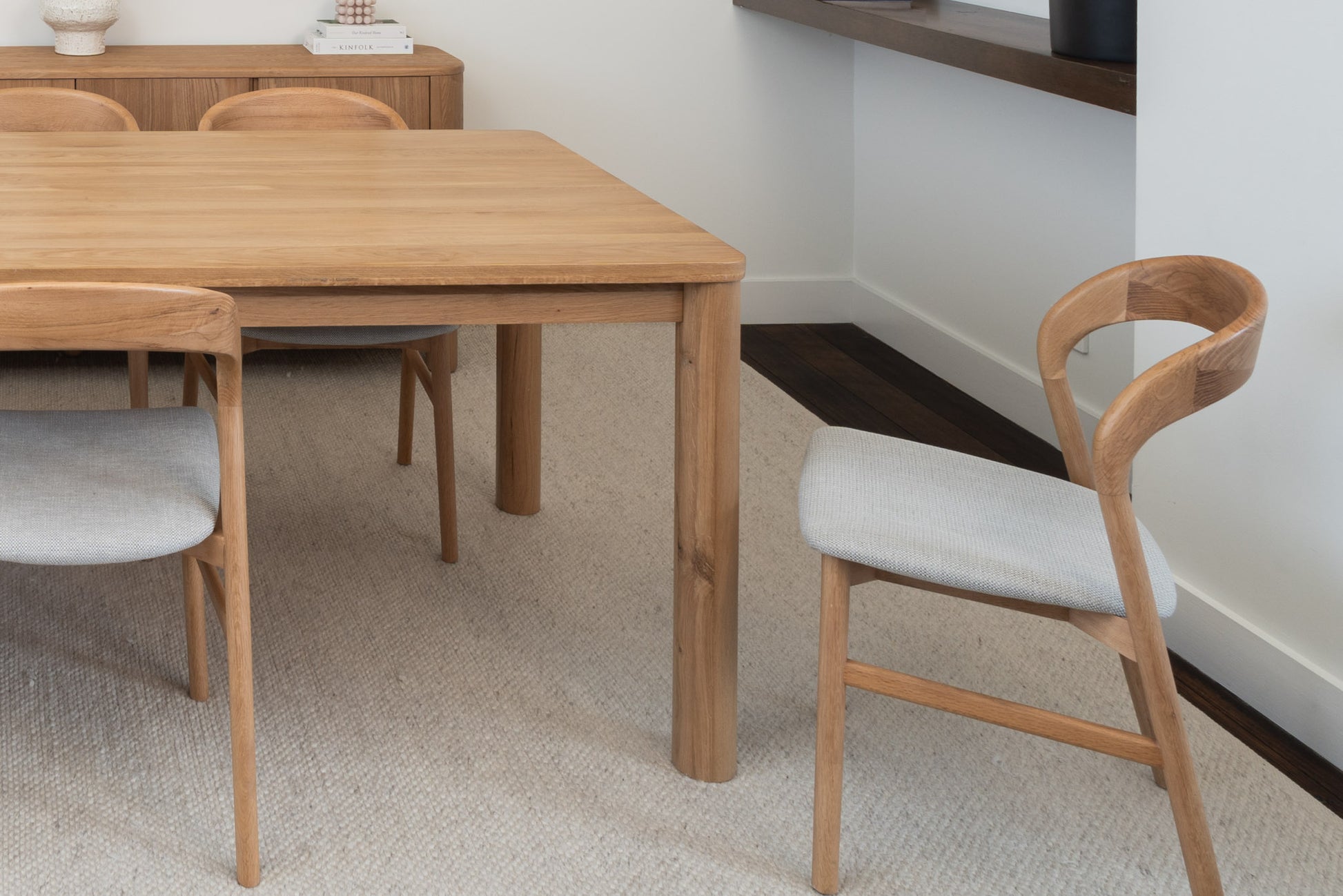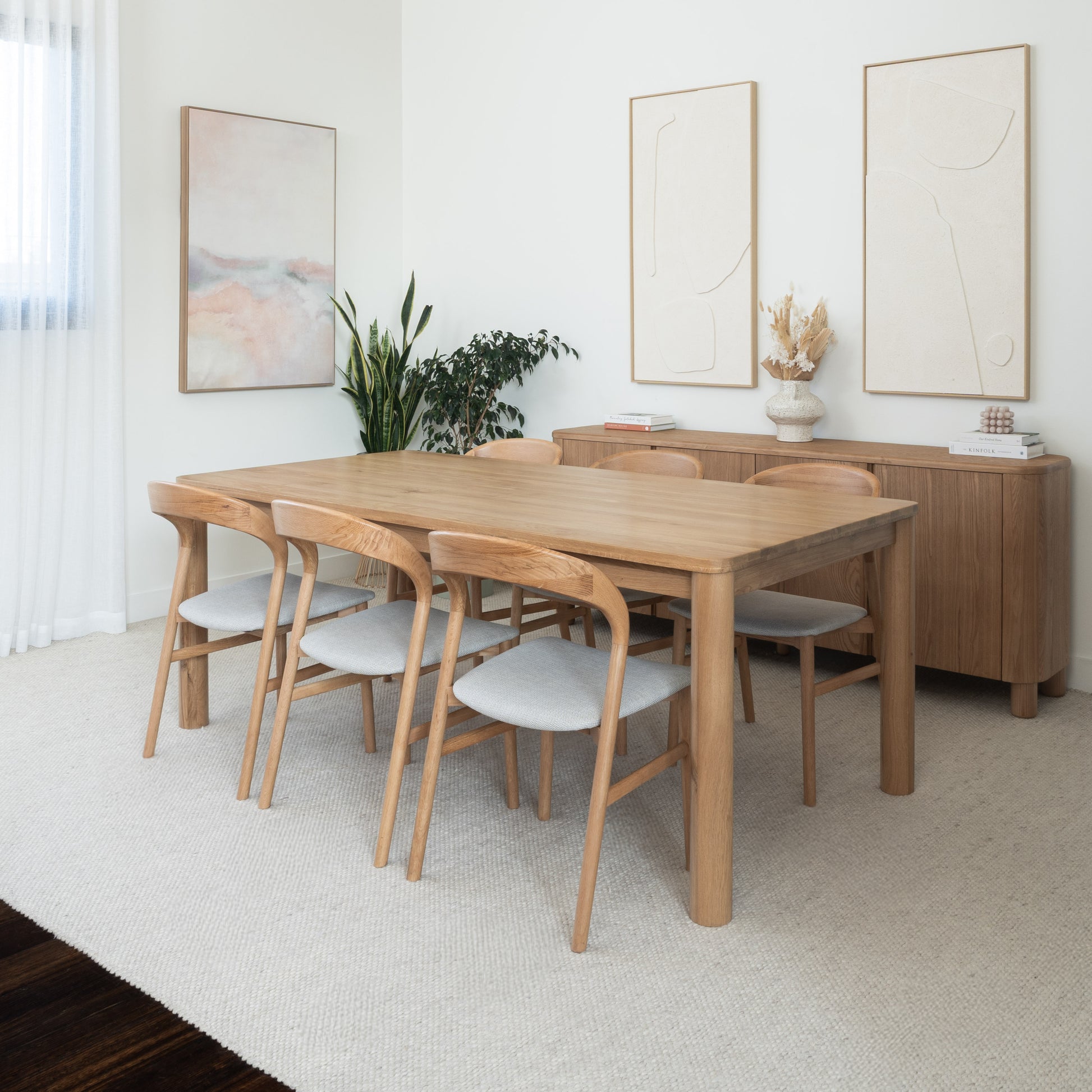 Introducing the Solara Dining Table, beautifully crafted from 100% American oak with soft, rounded corners for a sleek and inviting look. This elegant design features a seamless finish and gentle curves that bring warmth and refinement to any dining space. Combining natural character with contemporary style, the Solara Dining Table is built for lasting durability and timeless appeal — the perfect centrepiece for shared meals and memorable moments.