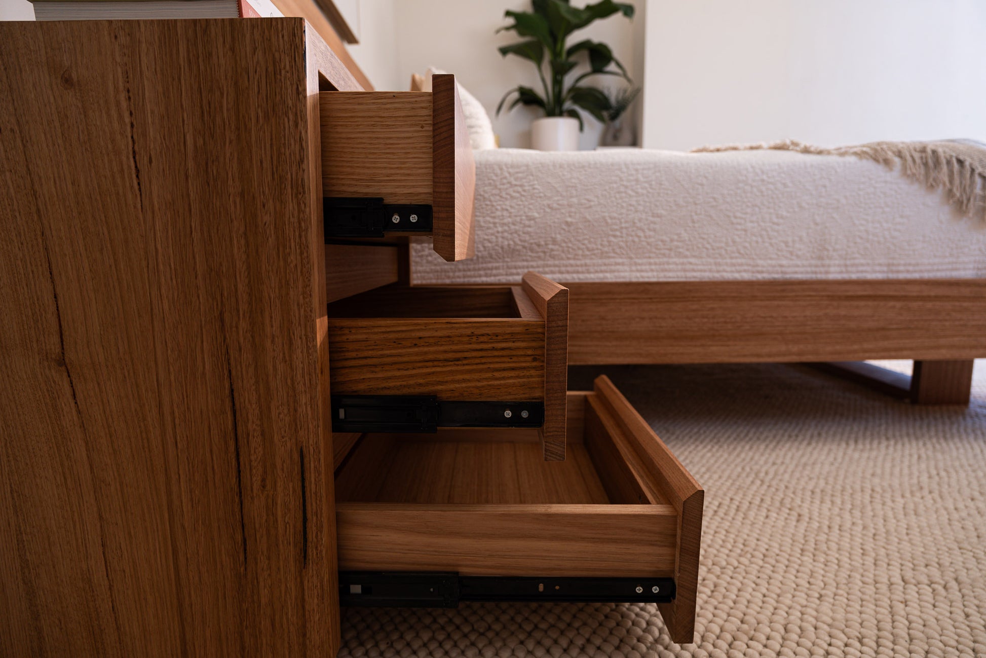 Discover the Cape Town Tasmanian Oak Bedside Table, sustainable Australian-made furniture proudly handcrafted in Melbourne from solid Tasmanian Oak timber. Featuring a bold 33mm solid border. Made to perfection, it’s built for a lifetime of durability. Elevate your space with craftsmanship that speaks volumes.