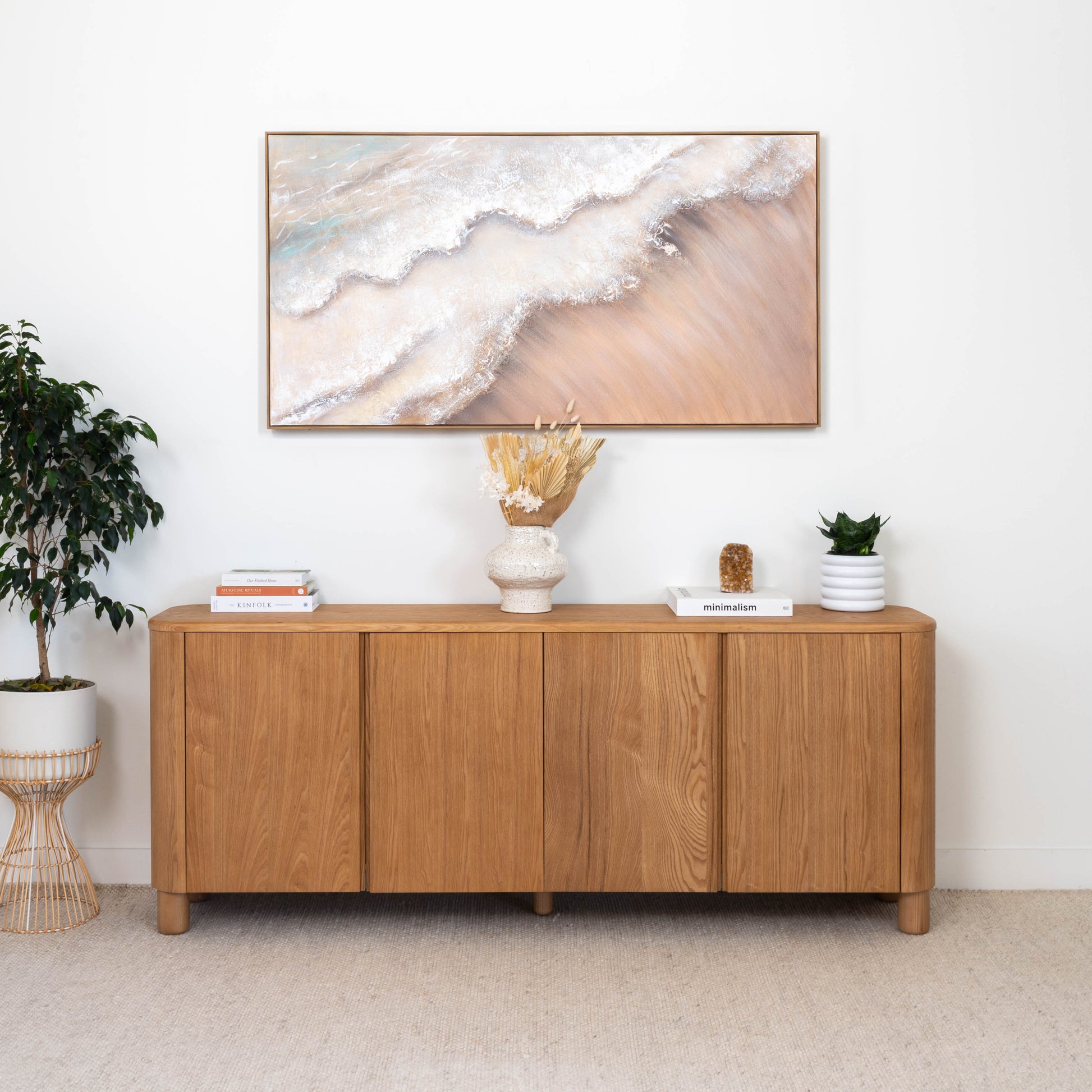 Discover the Solstice sideboard crafted from ash plywood with rounded cylindrical solid ash wood legs. It features four soft-close doors and an interior shelf that neatly divides the space into two levels, offering ample storage. Adjustable feet ensure stability on uneven floors. The Solstice collection showcases a harmony of straight lines merged dynamic curved shapes, all presented in naturally finished ash wood. Each piece proudly displays unique wood characteristics, ensuring individuality