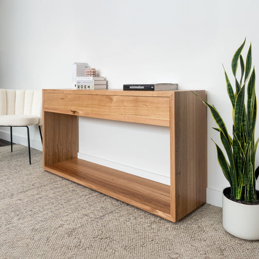 Searching for a timber console table with drawers that will fit seamlessly into space? You’ve come to the right place. Not only do our console and hall tables offer a variety of storage options, but they’re just visually appealing as they are practical. We offer a variety of sustainable materials, including messmate and Tasmanian oak, but many of our tables come pre-assembled, making adding a touch of elegance to your home easier than ever. Our Hamilton Console Table and Seika Console Table are two great examples of modern timber console tables.