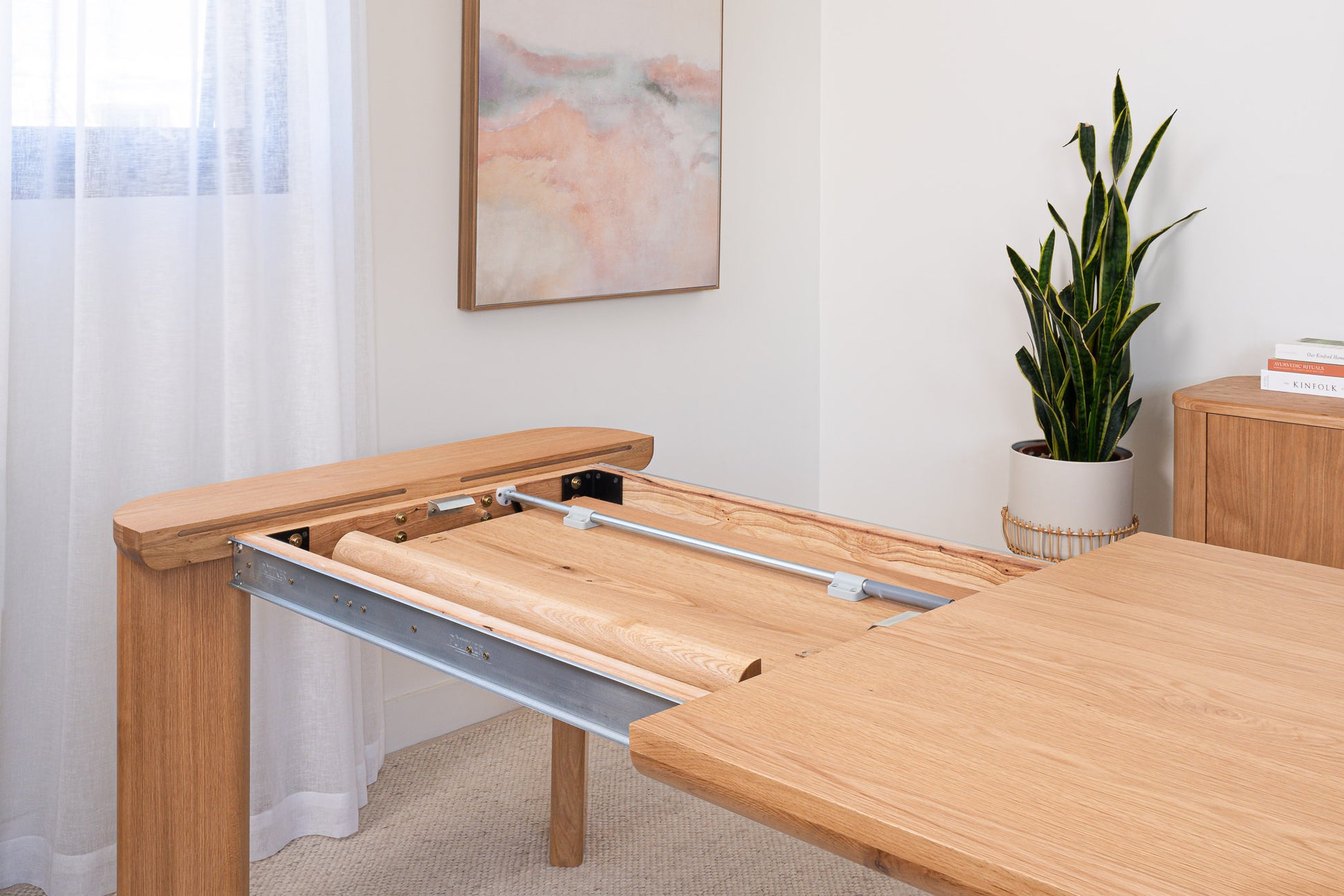 Easy-opening extension with butterfly mechanism. Includes an 80 cm extension concealed inside the table.