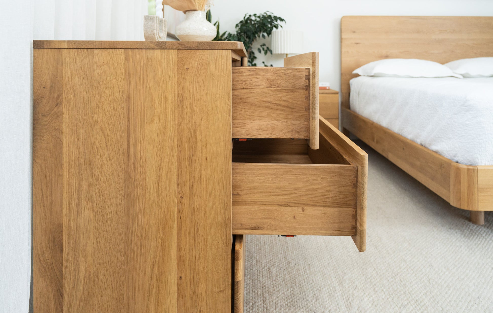 Introducing the Solara dresser, part of our refined Solara bedroom range. Crafted from 100% American oak, it showcases soft, rounded corners for a sleek, inviting look. With luxurious, lined drawers that feature smooth, push-to-open technology, this piece merges practicality with a modern aesthetic. Designed to bring natural warmth and contemporary elegance, the Solara range is perfect for enhancing any bedroom with lasting comfort and style.