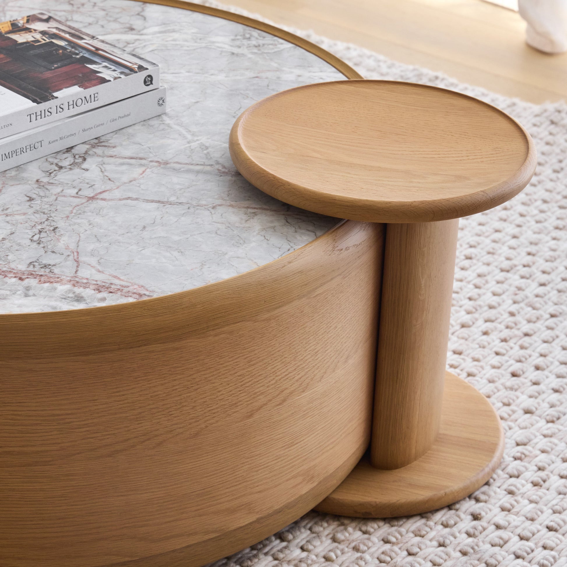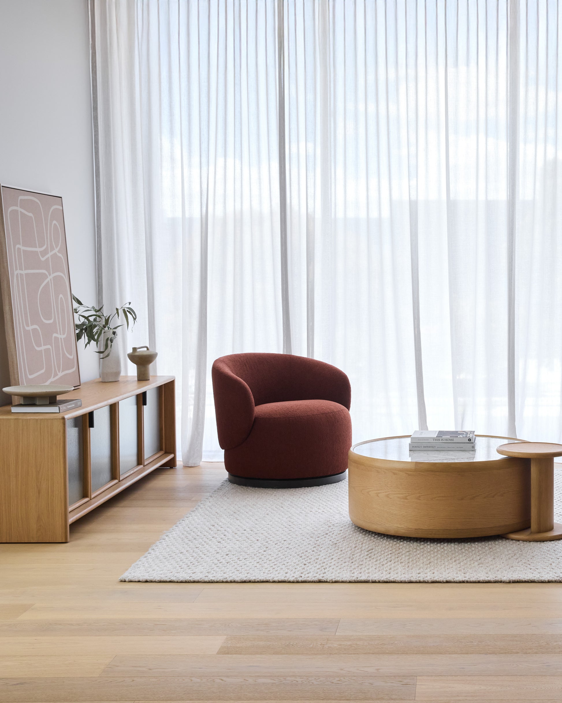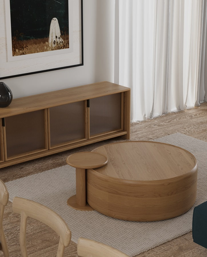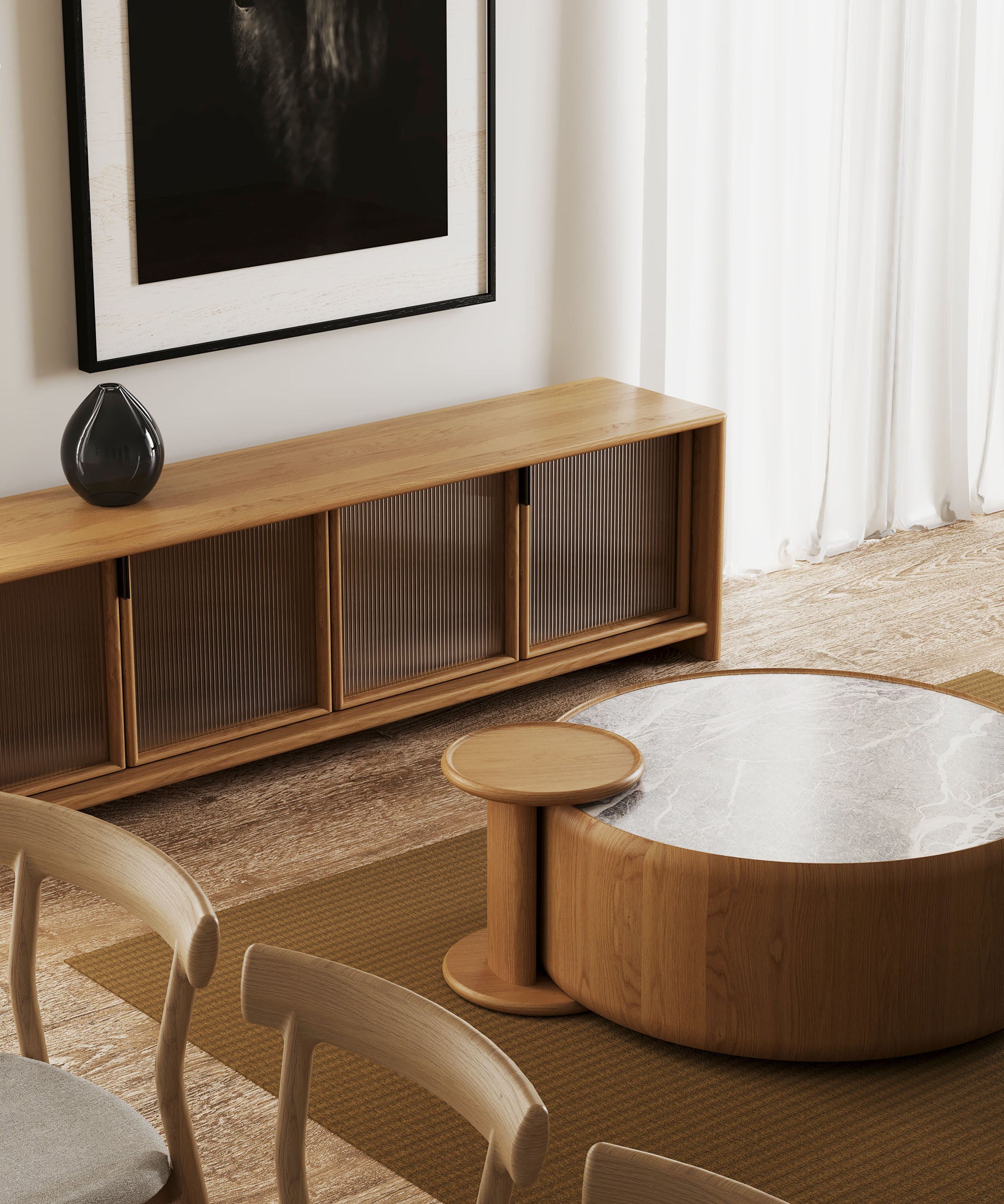 Mila Collection—crafted elegance meets timeless design. Featuring natural American oak veneer with solid timber details, each piece showcases a fine, strong grain with unique variations. The collection’s signature folded blade leg design ensures uninterrupted seating, while fluted tempered glass cabinet doors with magnetic catches add refined detail. Black powder-coated steel handles, subtly set back, enhance the minimalist aesthetic. Coffee tables boast real marble tops, and side tables feature a solid oak scalloped edge. Thoughtfully designed for both beauty and function, the Mila Collection brings warmth and sophistication to any space.