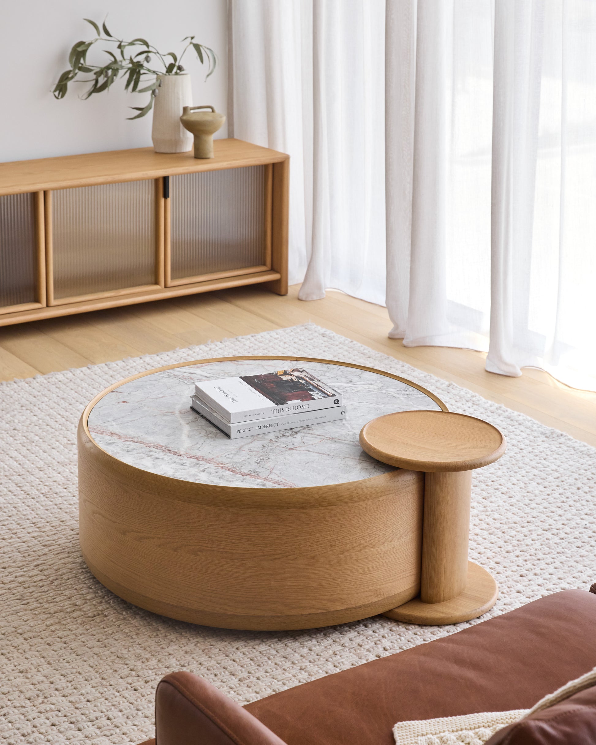 Our collection features finely crafted veneer tabletops with solid timber edge capping, ensuring a seamless and polished finish. Dining table legs and case goods are built with veneer and solid timber end capping for added strength. Coffee tables are available with either veneer timber or luxurious Vigo Lena marble tops, while sturdy solid timber frames with tempered glass inserts bring a refined touch to cabinet doors.