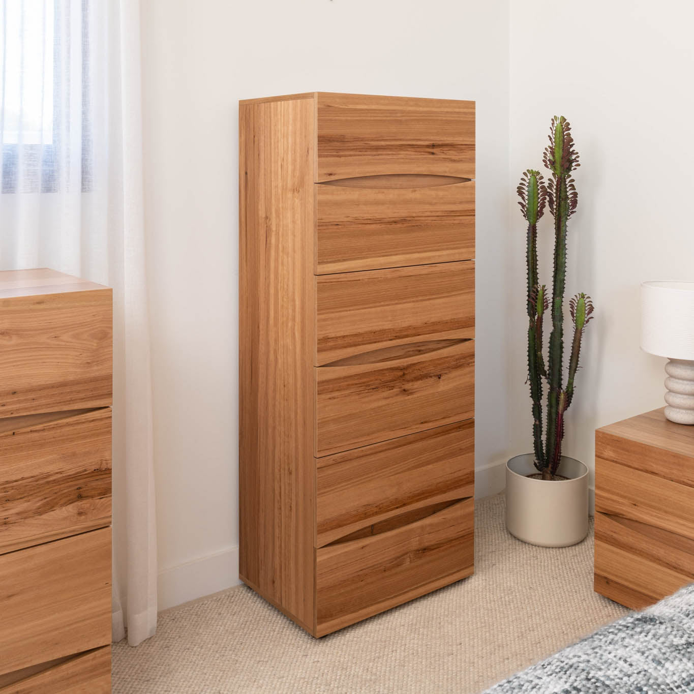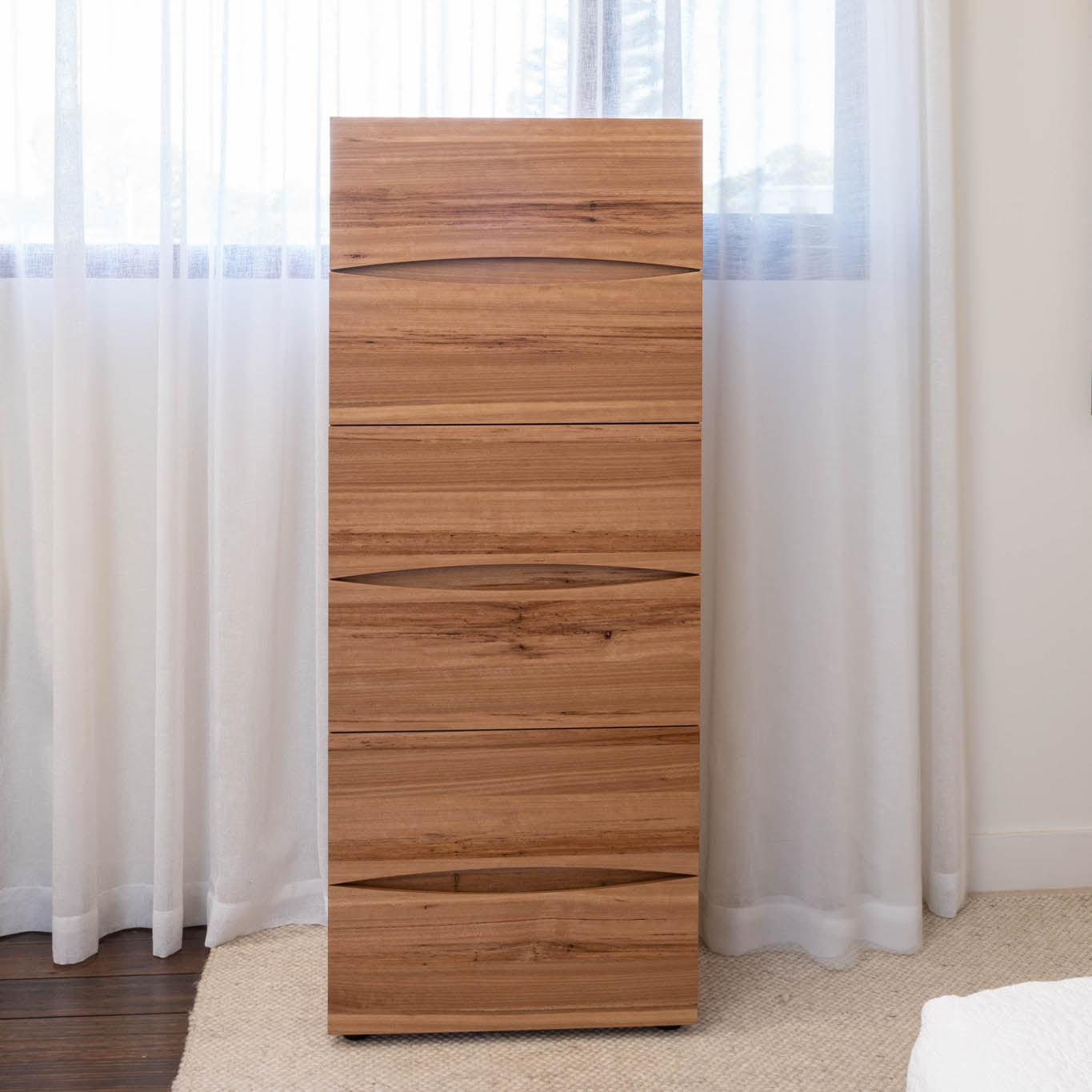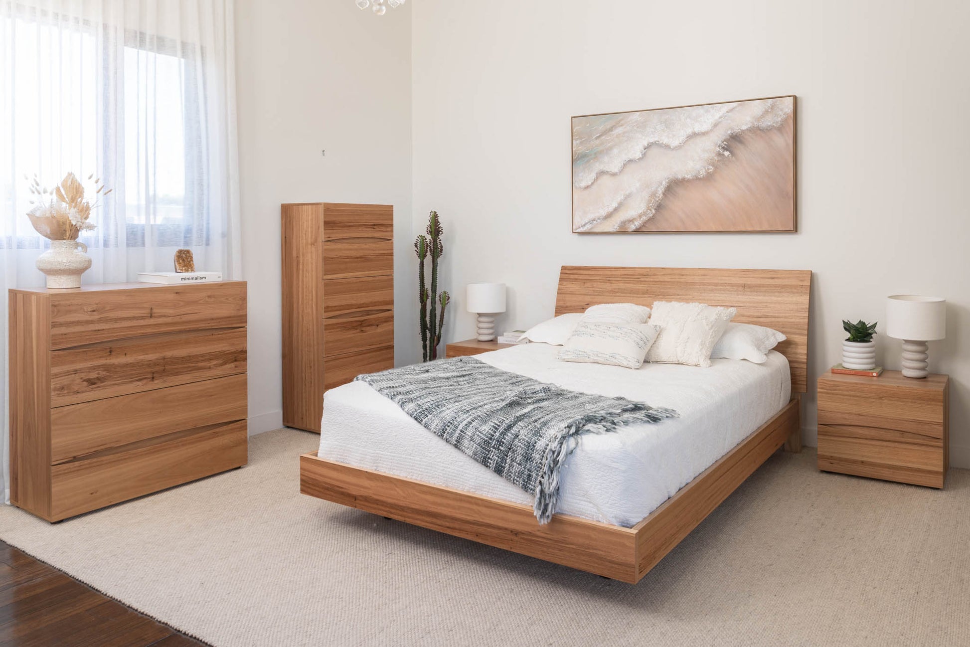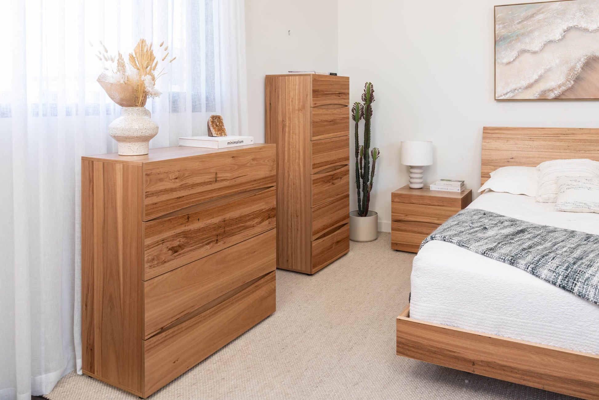 Explore the Citrine Bedroom Range, proudly 100% Australian Made, complete with matching case goods. Expertly crafted in Melbourne with beautiful Australian Wormy Chestnut. Each piece is styled with curved indented handles, enhancing a minimalist and aesthetic look. The perfect blend of functionality with modern elegance, ideal for elevating your bedroom decor while offering ample storage solutions.